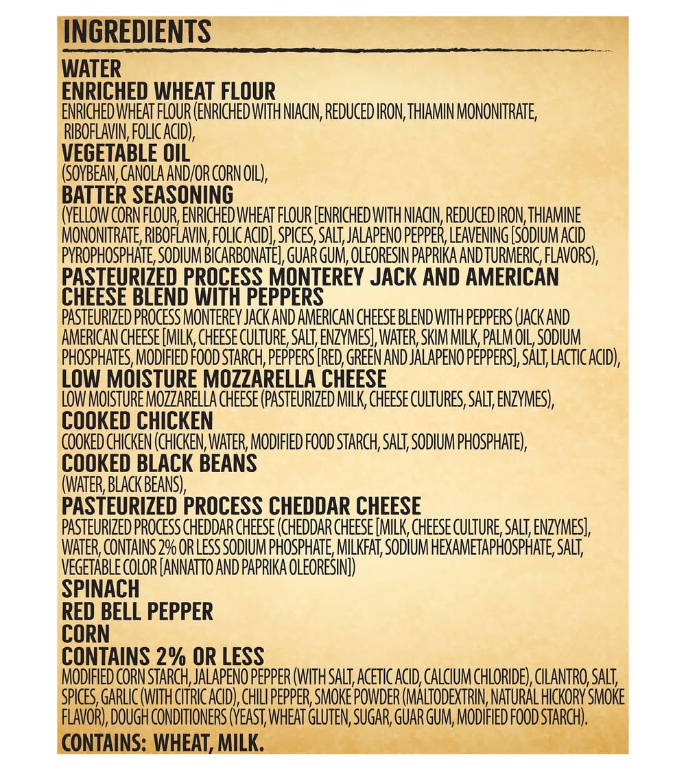 Ingredients: Water, Enriched Wheat Flour: Enriched Wheat Flour (Enriched with Niacin, Reduced Iron, Thiamin Mononitrate, Riboflavin, Folic Acid), Vegetable Oil (Soybean, Canola and/or Corn Oil), Batter Seasoning (Yellow Corn Flour, Enriched Wheat Flour [Enriched with Niacin, Reduced Iron, Thiamine Mononitrate, Riboflavin, Folic Acid], Spices, Salt, Jalapeno Pepper, Leavening [Sodium Acid Pyrophosphate, Sodium Bicarbonate], Guar Gum, Oleoresin Paprika and Turmeric, Flavors), Pasteurized Process Monterey Jack and American Cheese Blend with Peppers: Pasteurized Process Monterey Jack and American Cheese Blend with Peppers (Jack and American Cheese [Milk, Cheese Culture, Salt, Enzymes], Water, Skim Milk, Palm Oil, Sodium Phosphates, Modified Food Starch, Peppers [Red, Green and Jalapeno Peppers], Salt, Lactic Acid), Low Moisture Mozzarella Cheese: Low Moisture Mozzarella Cheese (Pasteurized Milk, Cheese Cultures, Salt, Enzymes), Cooked Chicken: Cooked Chicken (Chicken, Water, Modified Food Starch, Salt, Sodium Phosphate), Cooked Black Beans (Water, Black Beans), Pasteurized Process Cheddar Cheese: Pasteurized Process Cheddar Cheese (Cheddar Cheese [Milk, Cheese Culture, Salt, Enzymes], Water, Contains 2% or Less Sodium Phosphate, Milkfat, Sodium Hexametaphosphate, Salt, Vegetable Color [Annatto and Paprika Oleoresin]), Spinach, Red Bell Pepper, Corn, Contains 2% or Less Modified Corn Starch, Jalapeno Pepper (with Salt, Acetic Acid, Calcium Chloride), Cilantro, Salt, Spices, Garlic (with Citric Acid), Chili Pepper, Smoke Powder (Maltodextrin, Natural Hickory Smoke Flavor), Dough Conditioners (Yeast, Wheat Gluten, Sugar, Guar Gum, Modified Food Starch) Contains: Wheat, Corn, Milk, Tree Nuts, Hickory Nuts, Gluten, Soybeans, Soybeans