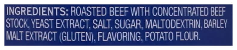 Ingredients: Roasted Beef with Concentrated Beef Stock, Yeast Extract, Salt, Sugar, Maltodextrin, Barley Malt Extract (Gluten), Flavoring, Potato Flour.