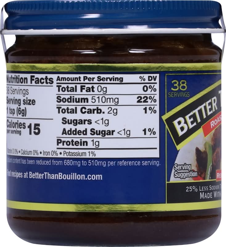 25% less sodium than our premium seasoned Roasted Chicken Base. Sodium content has been reduced from 680 mg to 510 mg per reference serving. 38 servings. Only 1 tsp better than bouillon = one cube or one 8 oz can. U.S. inspected and passed by Department of Agriculture. www.betterthanbouillon.com. For product information and recipes, visit our website: www.betterthanbouillon.com. Find recipes at BetterThanBouillon.com.