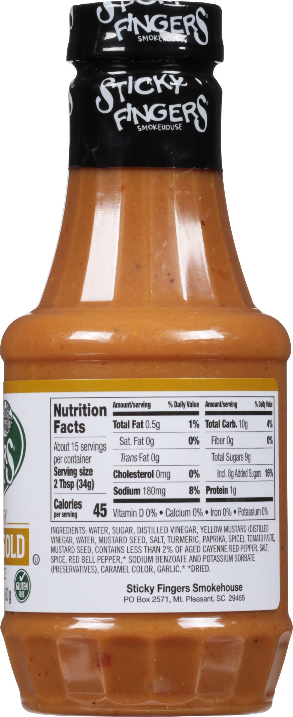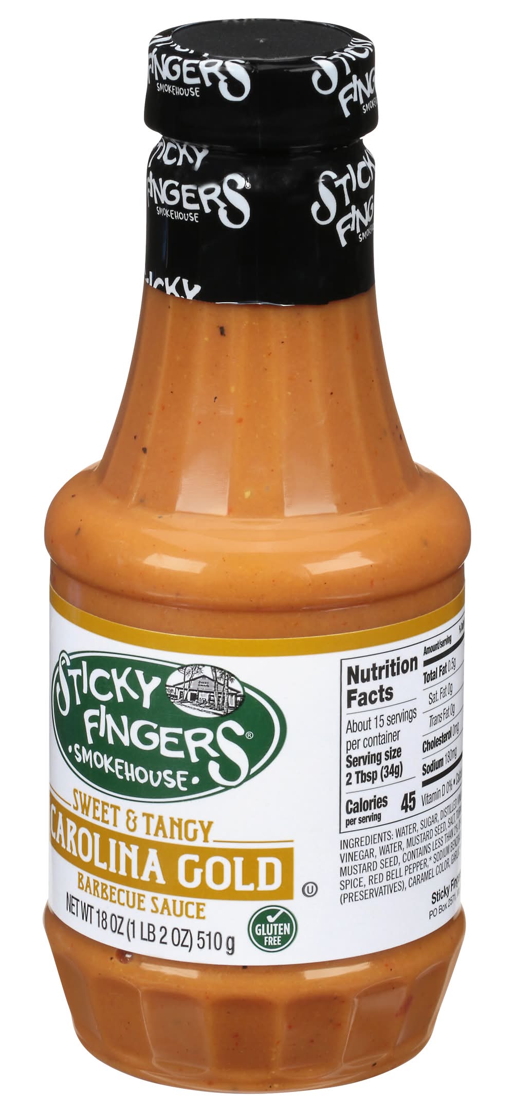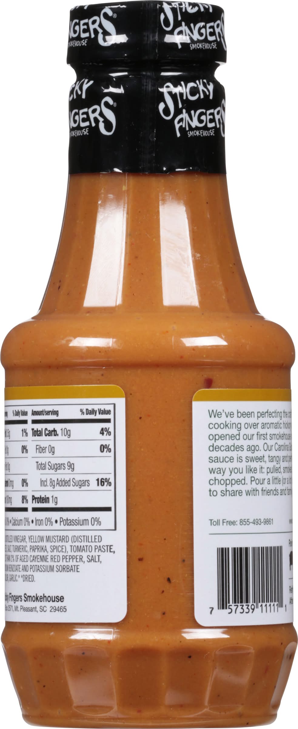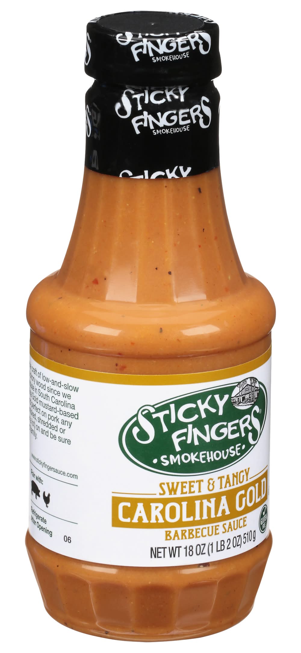 Gluten free. We've been perfecting the craft of low-and-slow cooking over aromatic hickory wood since we opened our first smokehouse in South Carolina decades ago. Our Carolina Gold mustard-based sauce is sweet, tangy and perfect on pork any way you like it: pulled, smoked, shredded or chopped. Pour a little (or a lot) on and be sure to share with friends and family. • Sticky Fingers Smokehouse, PO Box 2571,Mt. Pleasant,SC,29465 • Packaging: Reusable