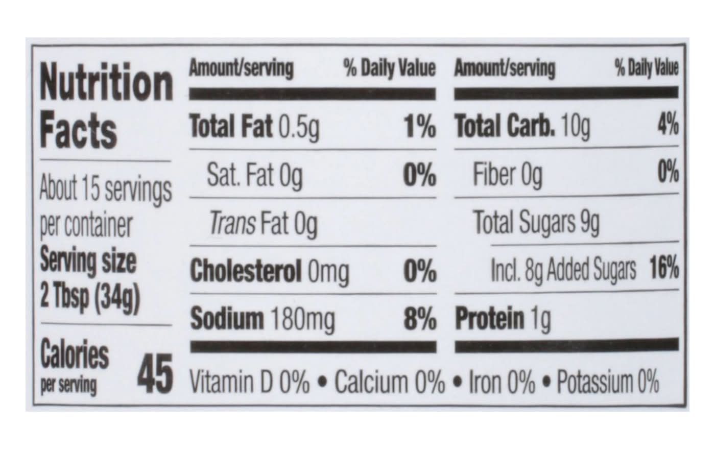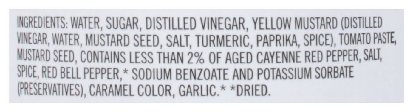 Ingredients: Water, Sugar, Distilled Vinegar, Yellow Mustard (Distilled Vinegar, Water, Mustard Seed, Salt, Turmeric, Paprika, Spice), Tomato Paste, Mustard Seed, Contains Less than 2% of Aged Cayenne Red Pepper, Salt, Spice, Red Bell Pepper, (Dried) Sodium Benzoate and Potassium Sorbate (Preservatives), Caramel Color, Garlic (Dried)