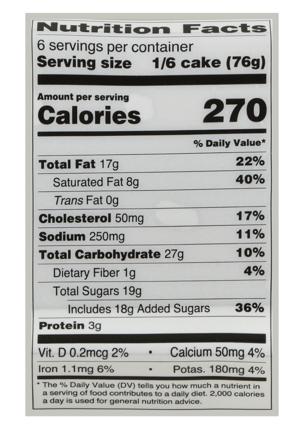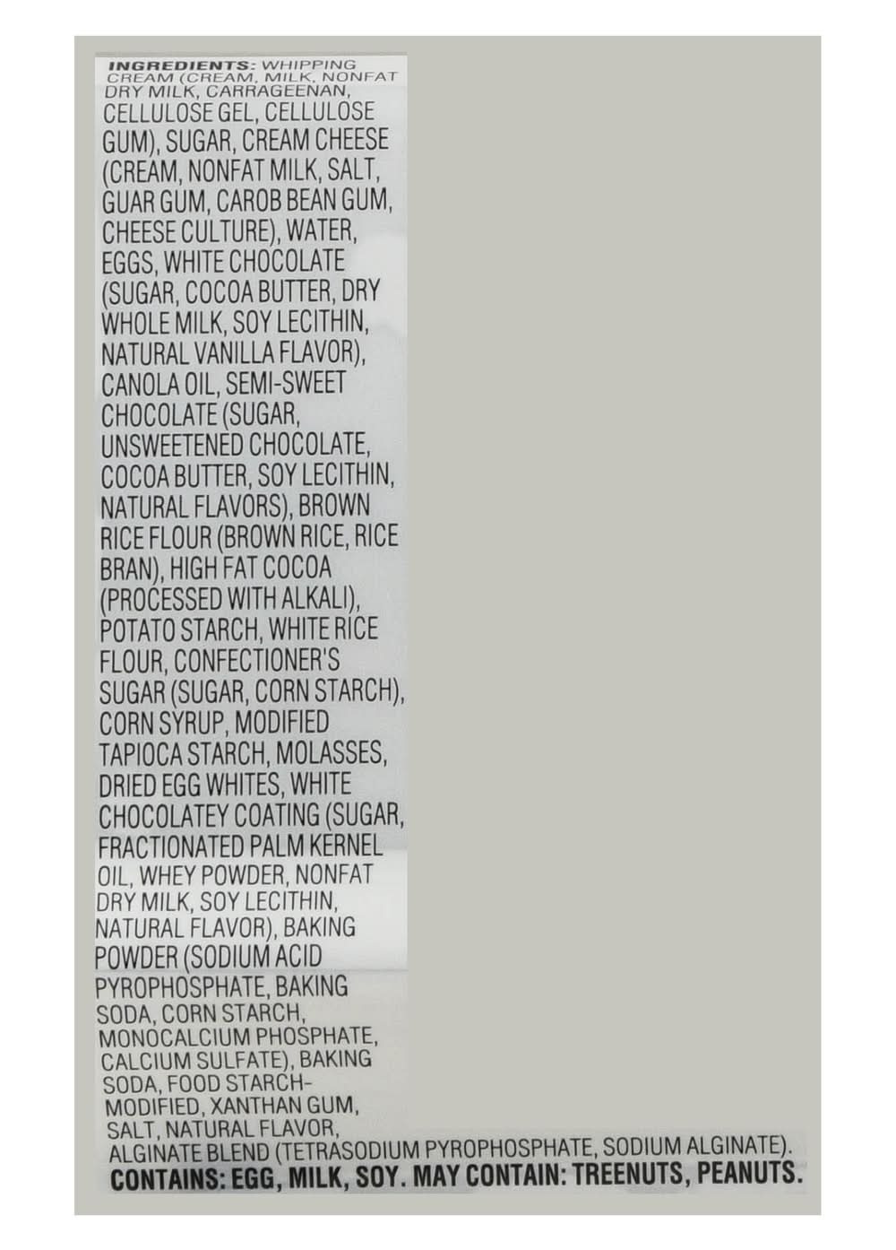 Ingredients: Whipping Cream (Cream, Milk, Nonfat Dry Milk, Carrageenan, Cellulose Gel, Cellulose Gum), Sugar, Cream Cheese (Cream, Nonfat Milk, Salt, Guar Gum, Carob Bean Gum, Cheese Culture), Water, Eggs, White Chocolate (Sugar, Cocoa Butter, Dry Whole Milk, Soy Lecithin, Natural Vanilla Flavor), Canola Oil, Semi-Sweet Chocolate (Sugar, Unsweetened Chocolate, Cocoa Butter, Soy Lecithin, Natural Flavors), Brown Rice Flour (Brown Rice, Rice Bran), High Fat Cocoa (Processed with Alkali), Potato Starch, White Rice Flour, Confectioner's Sugar (Sugar, Corn Starch), Corn Syrup, Modified Tapioca Starch, Molasses, Dried Egg Whites, White Chocolatey Coating (Sugar, Fractionated Palm Kernel Oil, Whey Powder, Nonfat Dry Milk, Soy Lecithin, Natural Flavor), Baking Powder (Sodium Acid Pyrophosphate, Baking Soda, Corn Starch, Monocalcium Phosphate, Calcium Sulfate), Baking Soda, Food Starch-Modified, Xanthan Gum, Salt, Natural Flavor, Alginate Blend (Tetrasodium Pyrophosphate, Sodium Alginate) Contains: 'Contains Milk', 'Contains Soybeans', 'May Contain Peanuts', 'May Contain Tree Nuts'