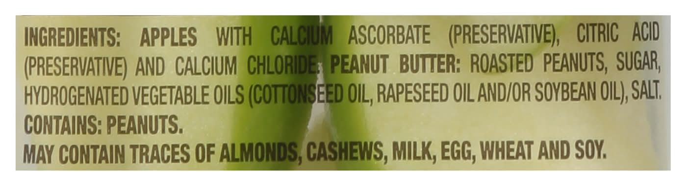 Ingredients: Apples with Calcium Ascorbate (Preservative), Citric Acid (Preservative) and Calcium Chloride, Peanut Butter: Roasted Peanuts, Sugar, Hydrogenated Vegetable Oils (Cottonseed Oil, Rapeseed Oil and/or Soybean Oil), Salt Contains: Peanuts, Soybeans, Tree Nuts, Almonds, Tree Nuts, Cashews, Milk, Eggs, Wheat, Soybeans