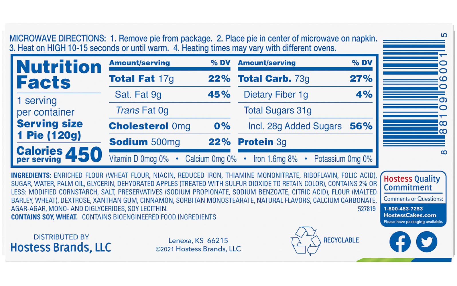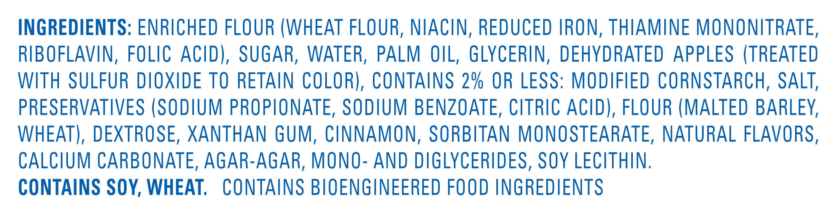 Ingredients: Enriched Flour (Wheat Flour, Niacin, Reduced Iron, Thiamine Mononitrate, Riboflavin, Folic Acid), Sugar, Water, Palm Oil, Glycerin, Dehydrated Apples (Treated With Sulfur Dioxide To Retain Color), Contains 2% Or Less: Modified Cornstarch, Salt, Preservatives (Sodium Propionate, Sodium Benzoate, Citric Acid), Flour (Malted Barley, Wheat), Dextrose, Xanthan Gum, Cinnamon, Sorbitan Monostearate, Natural Flavors, Calcium Carbonate, Agar-Agar, Mono- And Diglycerides, Soy Lecithin. Contains Soy, Wheat. Contains Bioengineered Food Ingredients Contains: Contains Soy, Wheat. Contains Bioengineered Food Ingredients.