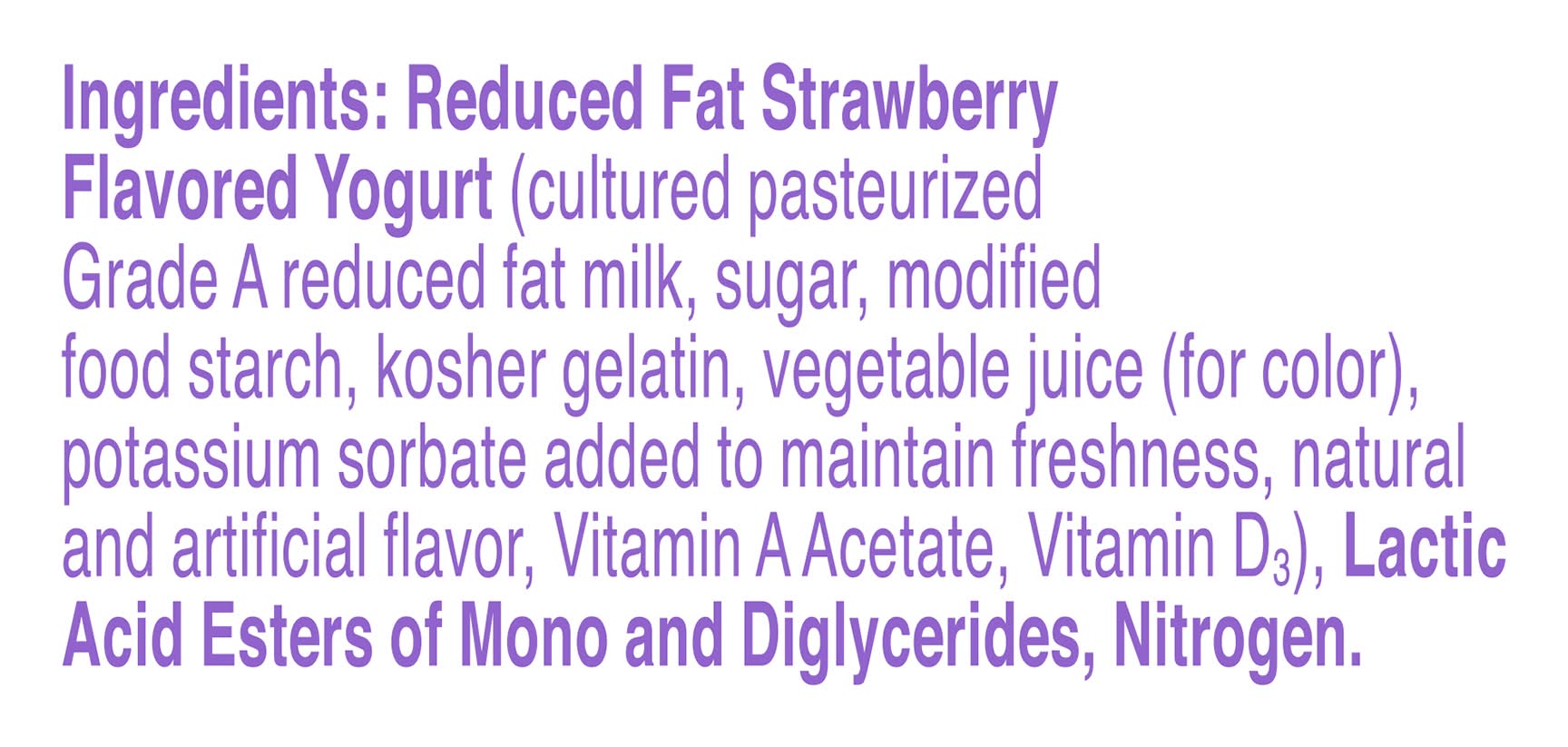 Ingredients: Reduced Fat Strawberry Flavored Yogurt (Cultured Pasteurized Grade A Reduced Fat Milk, Sugar, Modified Food Starch, Kosher Gelatin, Vegetable Juice (for Color), Potassium Sorbate Added to Maintain Freshness, Natural and Artificial Flavor, Vitamin A Acetate, Vitamin D3), Lactic Acid Esters of Mono and Diglycerides, Nitrogen Contains: Milk