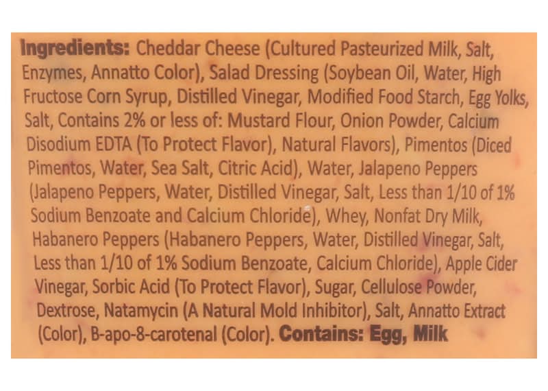Ingredients: Cheddar Cheese (Cultured Pasteurized Milk, Salt, Enzymes, Annatto Color), Salad Dressing (Soybean Oil, Water, High Fructose Corn Syrup, Distilled Vinegar, Modified Food Starch, Egg Yolks, Salt, Contains 2% or Less of: Mustard Flour, Onion Powder, Calcium Disodium EDTA (to Protect Flavor), Natural Flavors), Pimentos (Diced Pimentos, Water, Sea Salt, Citric Acid), Water, Jalapeno Peppers (Jalapeno Peppers, Water, Distilled Vinegar, Salt, Less than 1/10 of 1% Sodium Benzoate and Calcium Chloride), Whey, Nonfat Dry Milk, Habanero Peppers (Habanero Peppers, Water, Distilled Vinegar, Salt, Less than 1/10 of 1% Sodium Benzoate, Calcium Chloride), Apple Cider Vinegar, Sorbic Acid (to Protect Flavor), Sugar, Cellulose Powder, Dextrose, Natamycin (a Natural Mold Inhibitor), Salt, Annatto Extract (Color), B-Apo-8-Carotenal (Color).