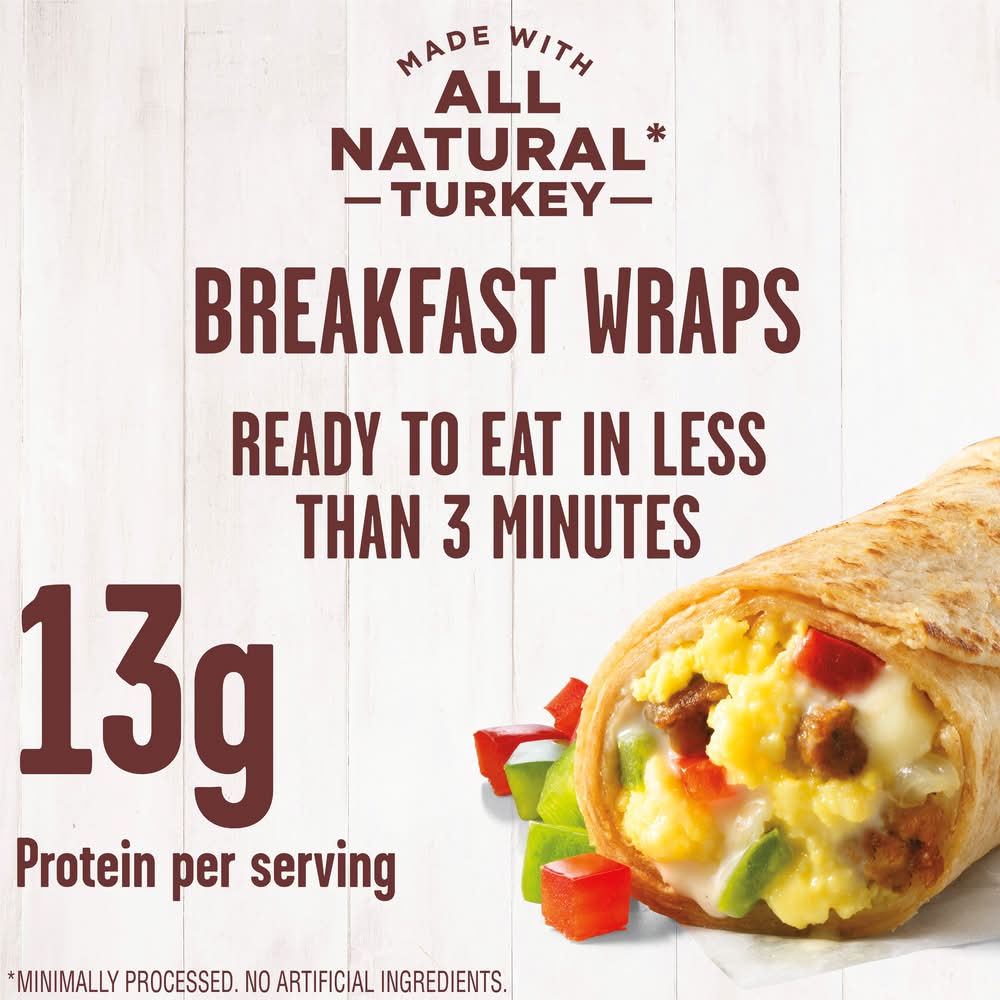 Enjoy a satisfying and convenient breakfast option with Turkey Sausage & Veggie Breakfast Wraps. Each wrap is filled with eggs, white cheddar cheese, turkey sausage, onions, and bell peppers, all encased in a whole wheat tortilla. Fully cooked and ready to heat, these wraps provide 13 grams of protein and 300 calories each, making them an excellent source of protein for your morning meal. • Number of servings: 4 • The Hillshire Brands Company, Chicago, IL, 60607 • Packaging: Reusable