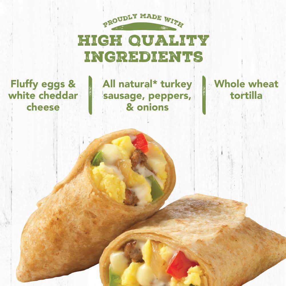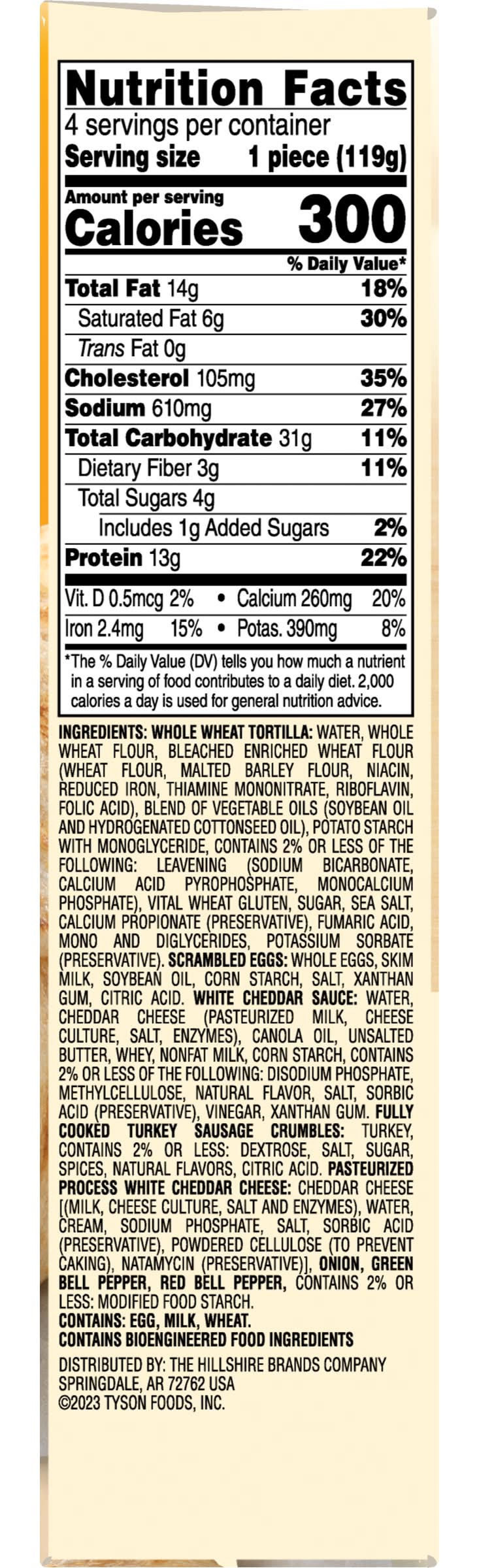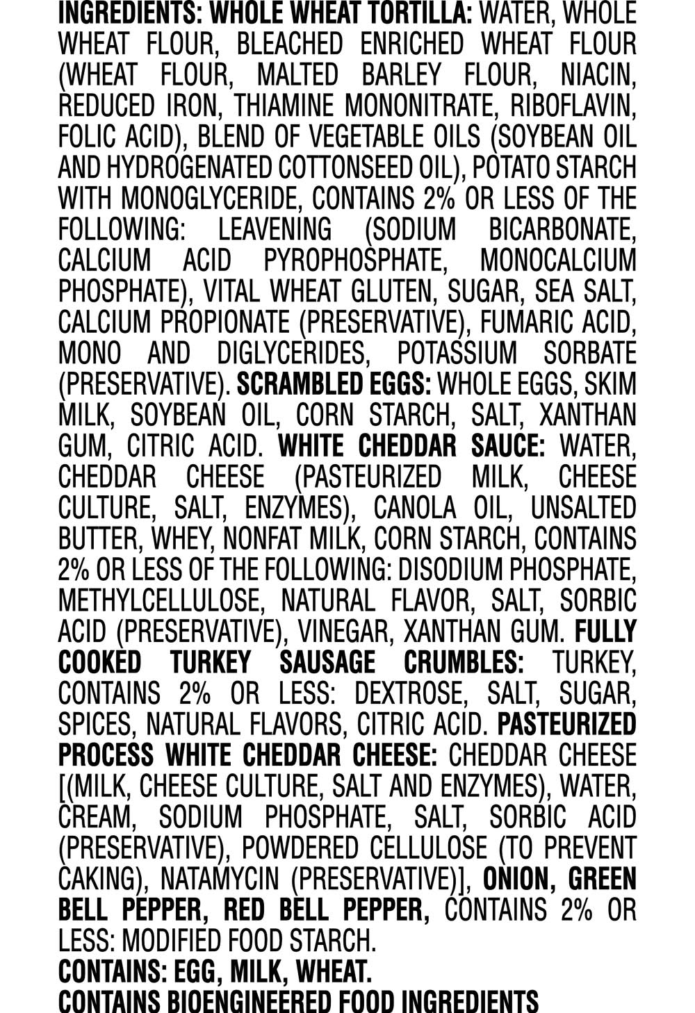 Ingredients: Whole Wheat Tortilla: Water, Whole Wheat Flour, Bleached Enriched Wheat Flour (Wheat Flour, Malted Barley Flour, Niacin, Reduced Iron, Thiamine Mononitrate, Riboflavin, Folic Acid), Blend Of Vegetable Oils (Soybean Oil And Hydrogenated Cottonseed Oil), Potato Starch With Monoglyceride, Contains 2% Or Less Of The Following: Leavening (Sodium Bicarbonate, Calcium Acid Pyrophosphate, Monocalcium Phosphate), Vital Wheat Gluten, Sugar, Sea Salt, Calcium Propionate (Preservative), Fumaric Acid, Mono And Diglycerides, Potassium Sorbate (Preservative). Scrambled Eggs: Whole Eggs, Skim Milk, Soybean Oil, Corn Starch, Salt, Xanthan Gum, Citric Acid. White Cheddar Sauce: Water, Cheddar Cheese (Pasteurized Milk, Cheese Culture, Salt, Enzymes), Canola Oil, Unsalted Butter, Whey, Nonfat Milk, Corn Starch, Contains 2% Or Less Of The Following: Disodium Phosphate, Methylcellulose, Natural Flavor, Salt, Sorbic Acid (Preservative), Vinegar, Xanthan Gum. Fully Cooked Turkey Sausage Crumbles: Turkey, Contains 2% Or Less: Dextrose, Salt, Sugar, Spices, Natural Flavors, Citric Acid. Pasteurized Process White Cheddar Cheese: Cheddar Cheese [(Milk, Cheese Culture, Salt And Enzymes), Water, Cream, Sodium Phosphate, Salt, Sorbic Acid (Preservative), Powdered Cellulose (To Prevent Caking), Natamycin (Preservative)], Onion, Green Bell Pepper, Red Bell Pepper, Contains 2% or Less: Modified Food Starch. Contains: Eggs, Milk, Wheat