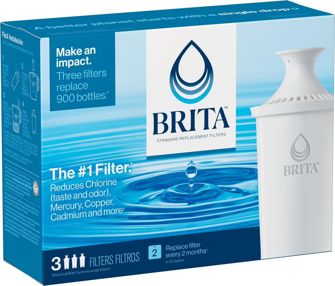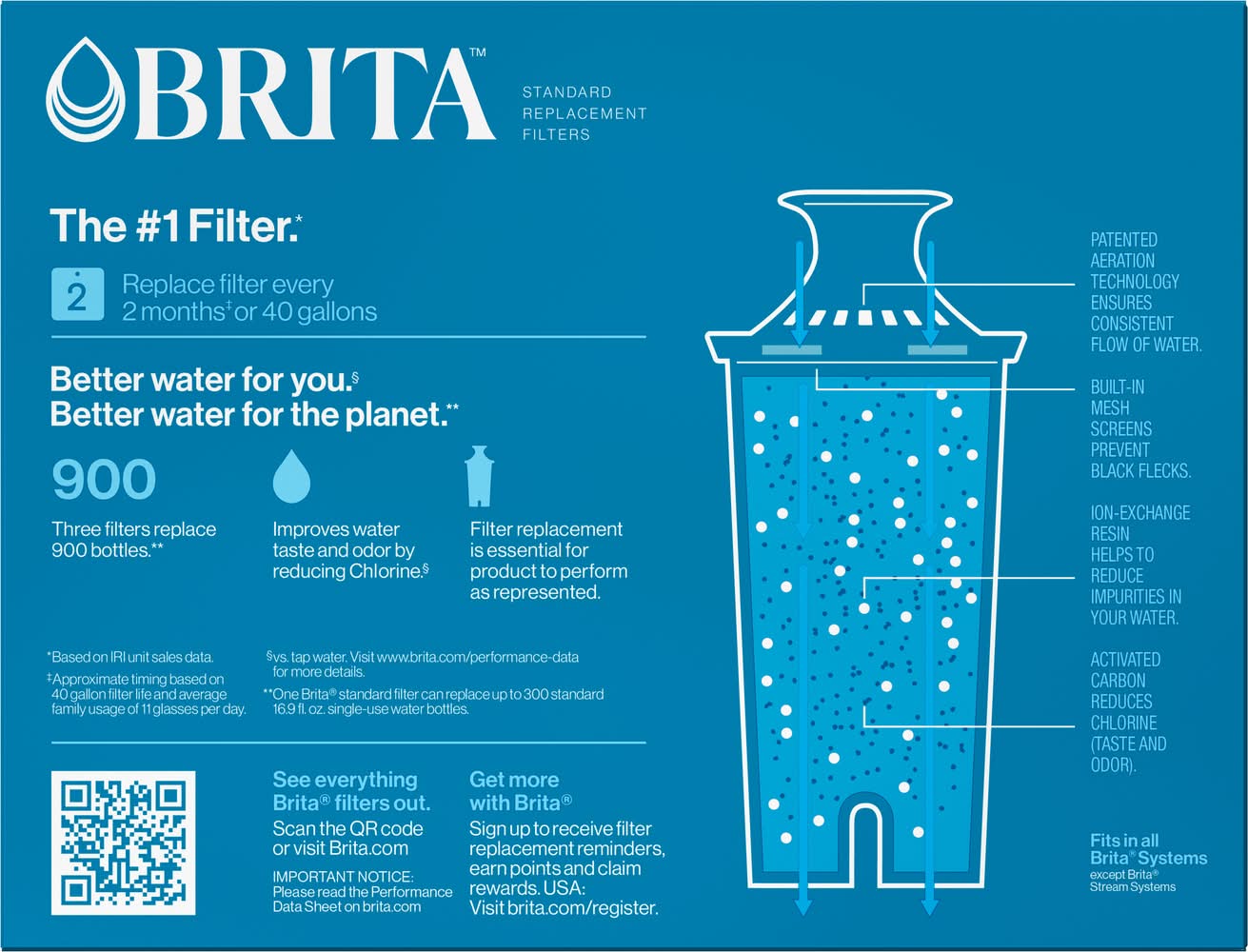 Make an impact. These filters replace 900 bottles. Reduces chlorine (taste and odor), mercury, copper, cadmium and more† Replace filter every 2 months‡ or 40 gallons Approximate timing based on 40-gallon filter life and average family usage of 11 glasses per day. Works in all Brita systems except Stream Better water for you.† Better water for the planet. One Brita standard filter can replace up to 300 standard 16.9 fl. oz. single-use water bottles. Improves water taste and odor by reducing chlorine. vs. tap water. The Brita standard filter keeps a healthy level of fluoride, a water additive that promotes strong teeth (applies to fluoridated municipal tap water). The contaminants or other substances removed or reduced by this water treatment device are not necessarily in all users' water. • Color: White • Brita Lp, 1221 Broadway,Oakland,CA,94612 • Packaging: Reusable