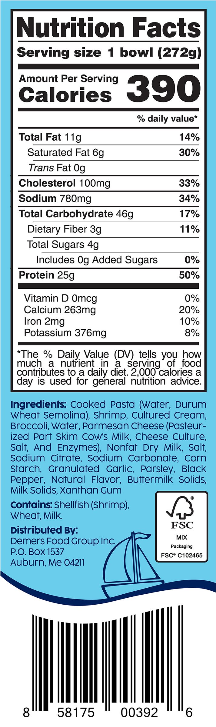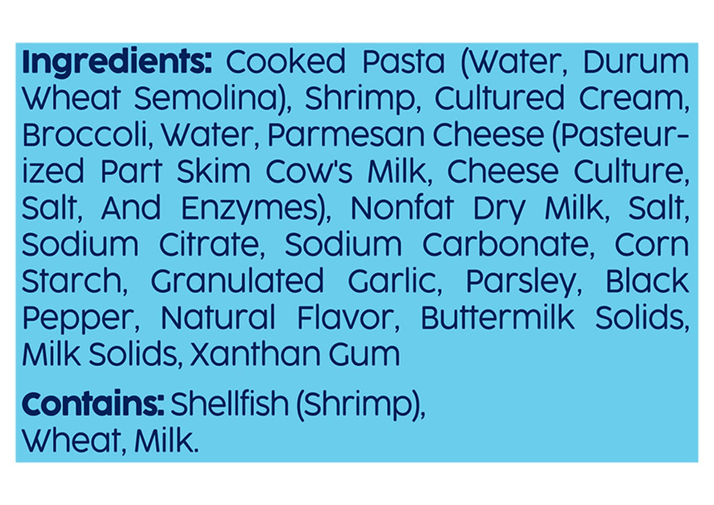 Ingredients: Cooked Pasta (Water, Durum Wheat Semolina), Shrimp, Cultured Cream, Broccoli, Water, Parmesan Cheese (Pasteurized Part Skim Cow's Milk, Cheese Culture, Salt, and Enzymes), Nonfat Dry Milk, Salt, Sodium Citrate, Sodium Carbonate, Corn Starch, Granulated Garlic, Parsley, Black Pepper, Natural Flavor, Buttermilk Solids, Milk Solids, Xanthan Gum Contains: Wheat, Milk, Corn, Shellfish (Shrimp)