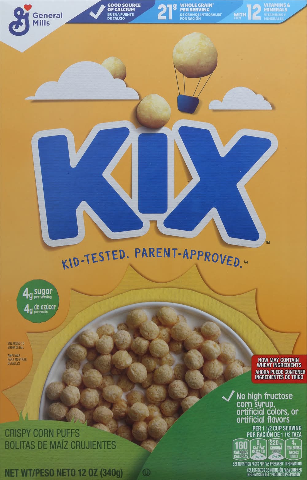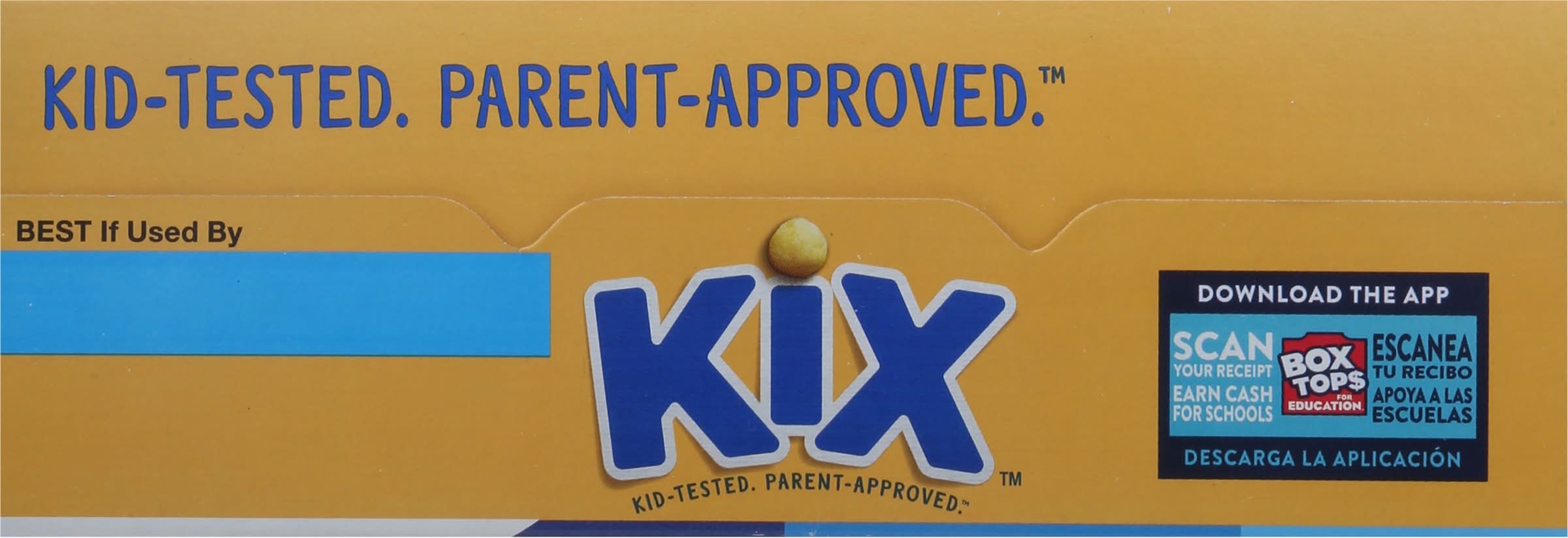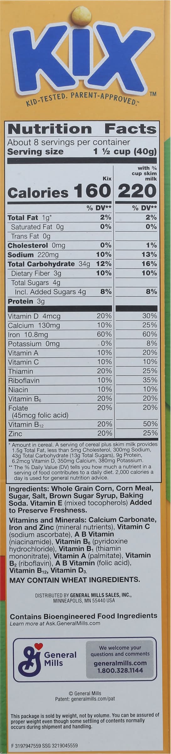 No high fructose corn syrup, artificial colors, or artificial flavors. 21 g whole grain per serving. 4 g sugar per serving. Per 1-1/2 Cup Serving: 160 calories; 0 g sat fat (0% DV); 220 mg sodium (10% DV); 4 g total sugars. Good source of calcium. With 12 vitamin & minerals. See nutrition facts for as prepared information. Contains bioengineered food ingredients. Learn more at Ask.GeneralMills.com. Kid-tested. Parent-approved. Now may contain wheat ingredients. No high fructose corn syrup, artificial colors, or artificial flavors. Tip: Kix is a great on-the-go snack! This package is sold by weight, not by volume. You can be assured of proper weight even though some settling of contents normally occurs during shipment and handling. generalmills.com. how2recycle.info. We welcome your questions and comments: Box Tops for Education: Download the app. Scan your receipt. Earn cash for schools. Certified 100% recycled paperboard. General mills sales, inc., Minneapolis,MN,55440,USA