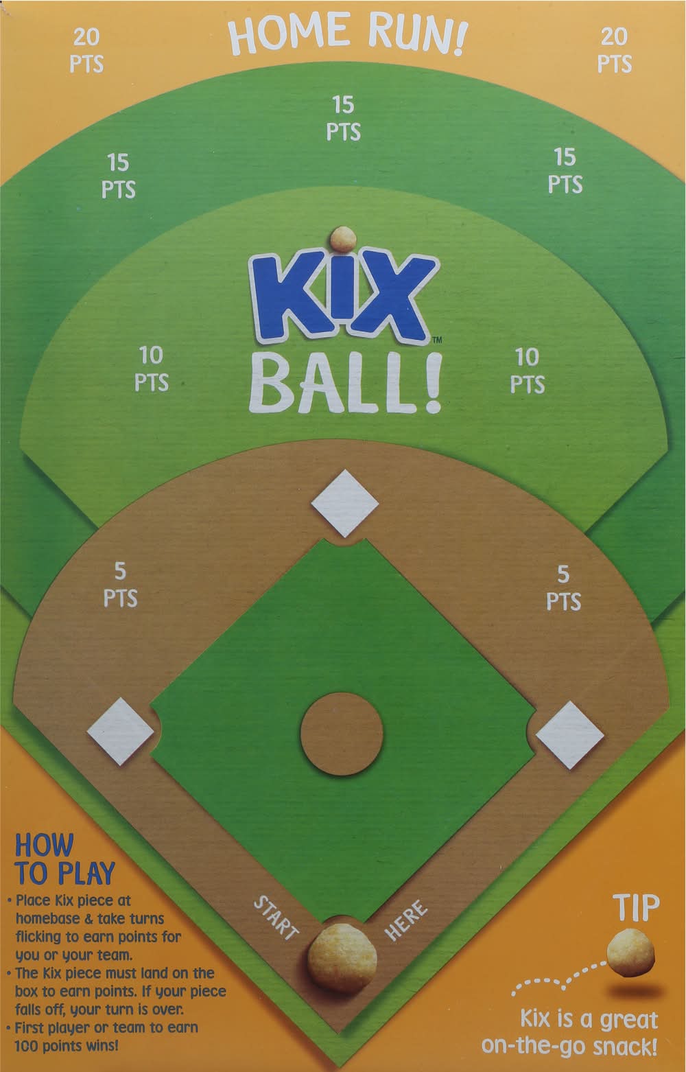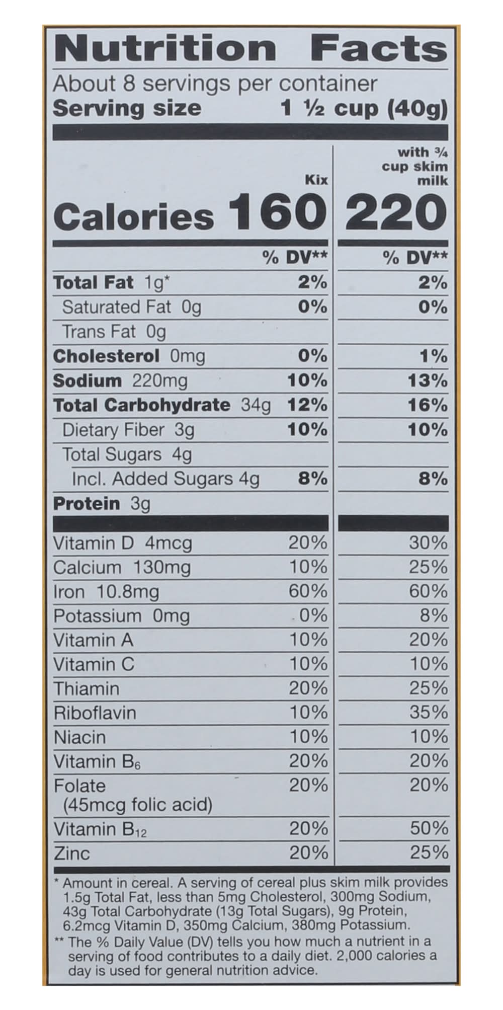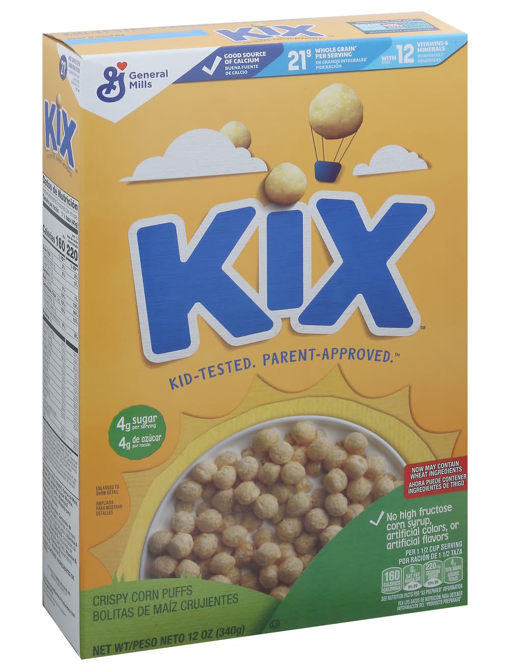 No high fructose corn syrup, artificial colors, or artificial flavors. 21 g whole grain per serving. 4 g sugar per serving. Per 1-1/2 Cup Serving: 160 calories; 0 g sat fat (0% DV); 220 mg sodium (10% DV); 4 g total sugars. Good source of calcium. With 12 vitamin & minerals. See nutrition facts for as prepared information. Contains bioengineered food ingredients. Learn more at Ask.GeneralMills.com. Kid-tested. Parent-approved. Now may contain wheat ingredients. No high fructose corn syrup, artificial colors, or artificial flavors. Tip: Kix is a great on-the-go snack! This package is sold by weight, not by volume. You can be assured of proper weight even though some settling of contents normally occurs during shipment and handling. generalmills.com. how2recycle.info. We welcome your questions and comments: Box Tops for Education: Download the app. Scan your receipt. Earn cash for schools. Certified 100% recycled paperboard. General mills sales, inc., Minneapolis,MN,55440,USA