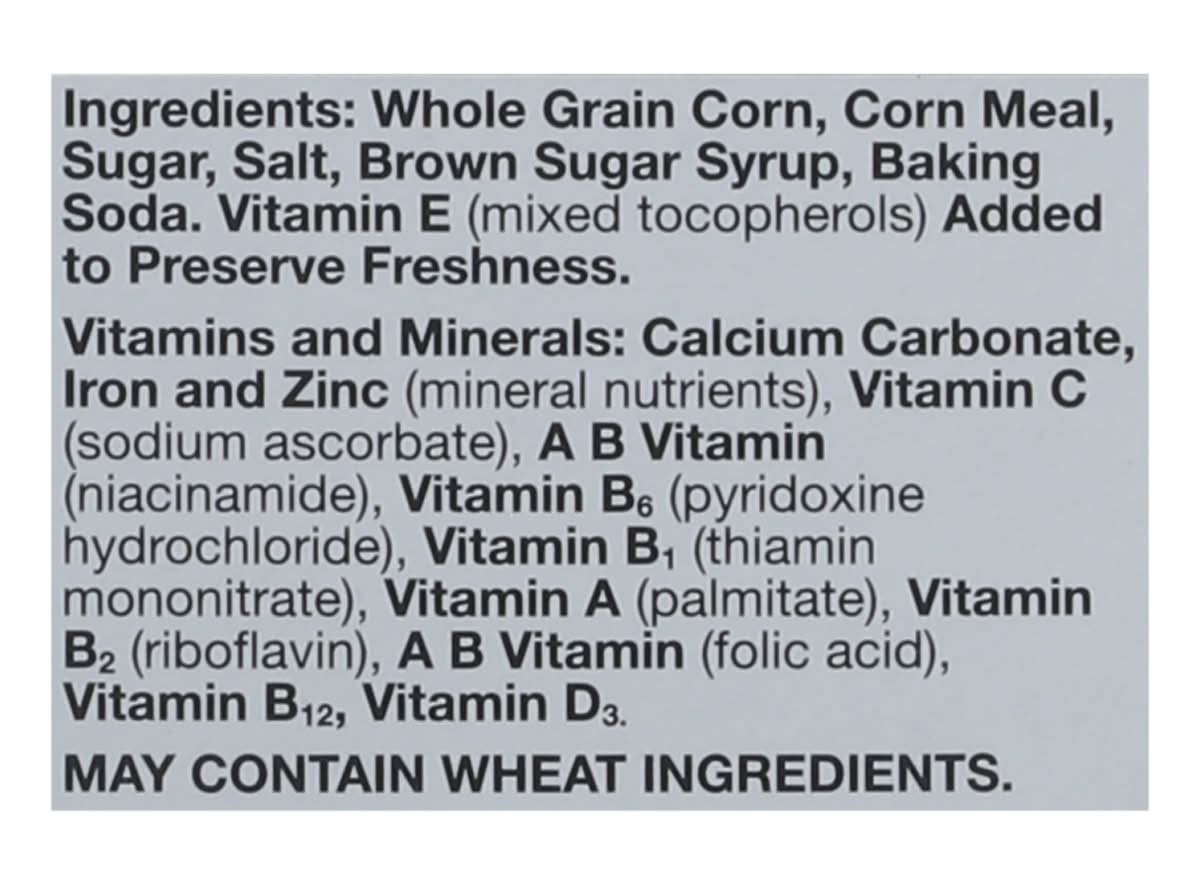 Ingredients: Whole Grain Corn, Corn Meal, Sugar, Salt, Brown Sugar Syrup, Baking Soda, Vitamin E (Mixed Tocopherols) Added to Preserve Freshness, Vitamins and Minerals: Calcium Carbonate, Iron and Zinc (Mineral Nutrients), Vitamin C (Sodium Ascorbate), a B Vitamin (Niacinamide), Vitamin B6 (Pyridoxine Hydrochloride), Vitamin B1 (Thiamin Mononitrate), Vitamin A (Palmitate), Vitamin B2 (Riboflavin), a B Vitamin (Folic Acid), Vitamin B12, Vitamin D3