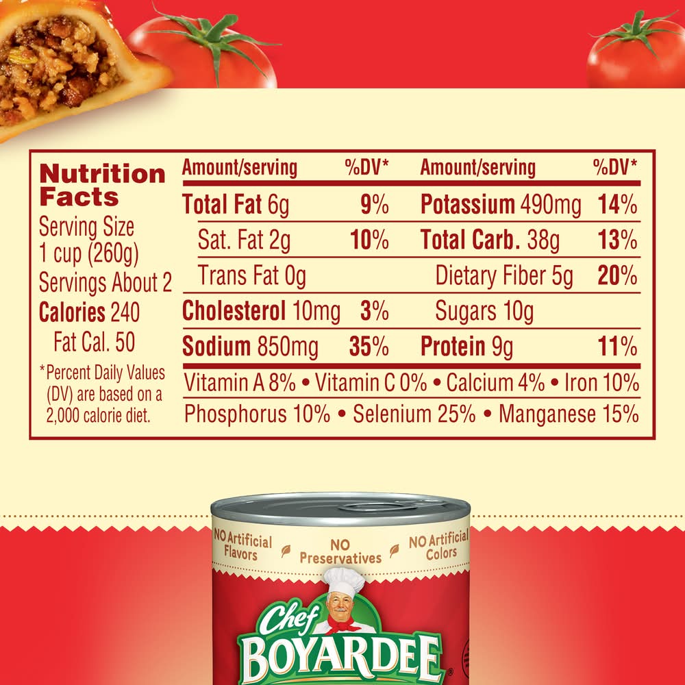 You'll love the taste of Chef Boyardee Overstuffed Italian Sausage Ravioli, a delicious and convenient meal that's ready to eat in minutes. Real Italian sausage and enriched pasta in a hearty tomato sauce give Chef Boyardee Overstuffed Italian Sausage Ravioli the timeless flavor that everyone loves. Ready to serve in just 90 seconds, Chef Boyardee Overstuffed Italian Sausage Ravioli is the heat-and-eat meal busy families can count on. Simple and easy to make, anyone can grab Chef Boyardee Overstuffed Italian Sausage Ravioli off the shelf when they need a quick snack. Chef Boyardee Overstuffed Italian Sausage Ravioli is packed with 9 grams of protein and 240 calories per serving in each 15 oz, easy-open can. With no artificial flavors, colors, or preservatives, Chef Boyardee makes a wholesome meal for kids of ALL ages. Conagra Brands, PO Box 3534,Dept. CB,Chicago,IL,60654