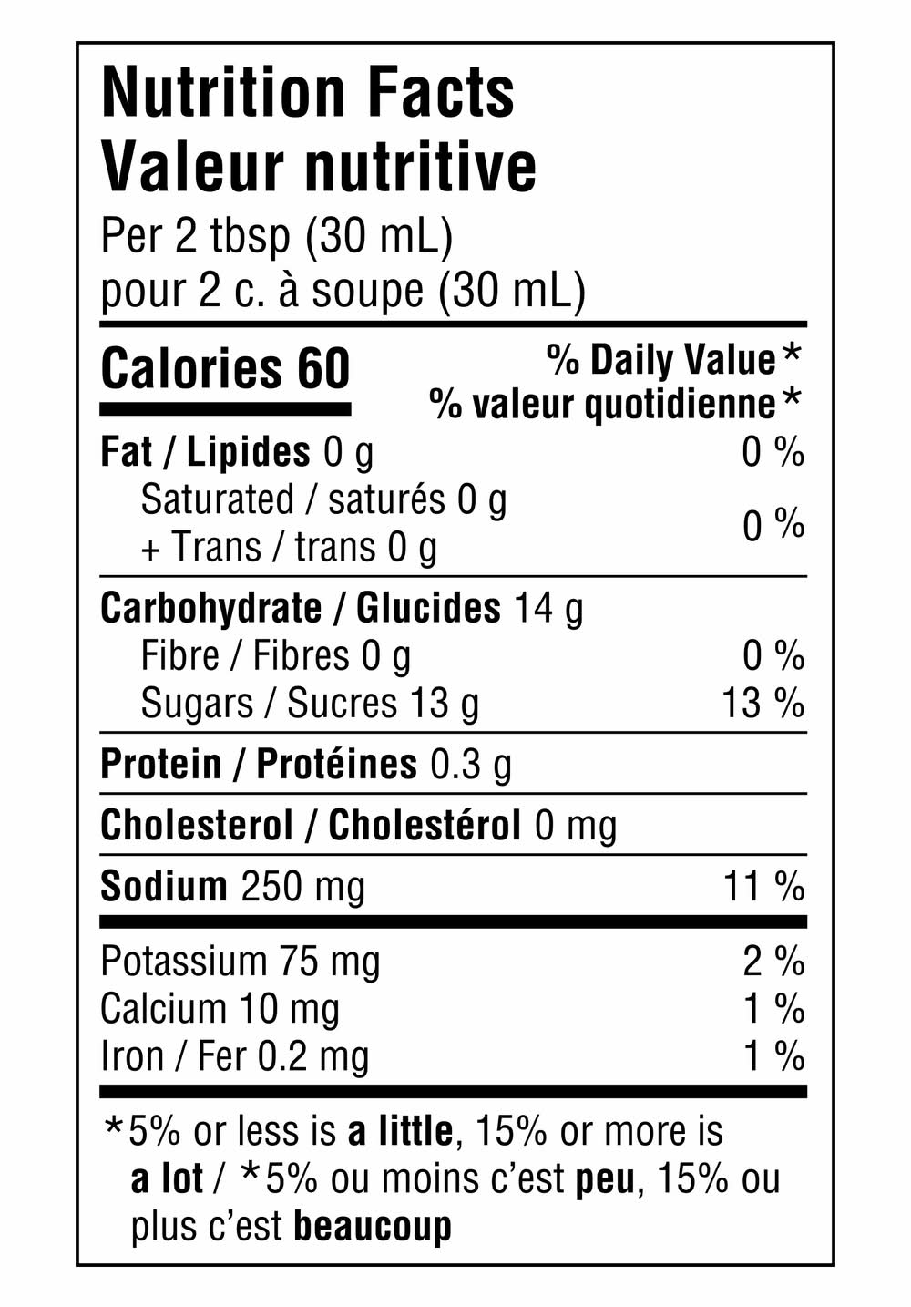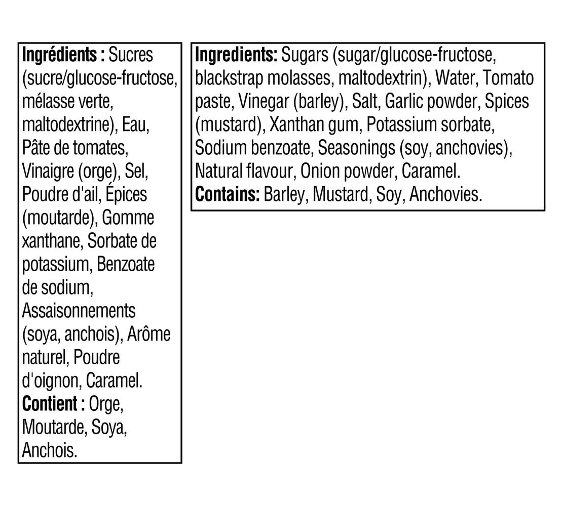 Ingredients: Sugar/glucose-fructose, Vinegar (Barley), Tomato Puree, Water, Salt, Garlic Powder, Blackstrap Molasses, Spices (Mustard), Xanthan Gum, Seasonings (Soy, Anchovies), Potassium Sorbate, Sodium Benzoate, Natural Flavour, Maltodextrin, Onion Powder, Molasses, Caramel. Contains: Barley, Mustard, Anchovies, Soy