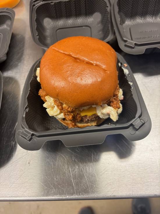 Cheeseburger with our house made Mac Salad and Michigan Sauce on a grilled brioche bun.