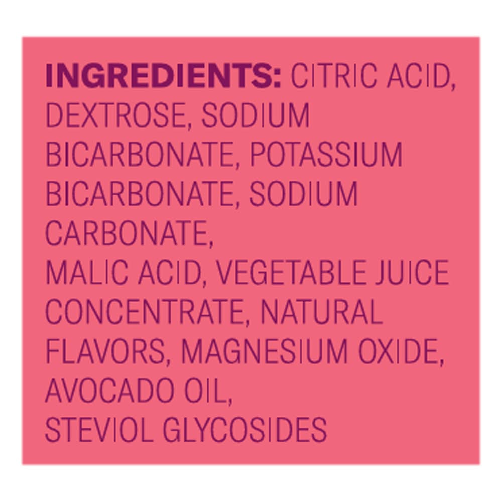 Ingredients: Citric Acid, Dextrose, Sodium Bicarbonate, Potassium Bicarbonate, Sodium Carbonate, Malic Acid, Vegetable Juice Concentrate, Natural Flavors, Magnesium Oxide, Avocado Oil, Steviol Glycosides