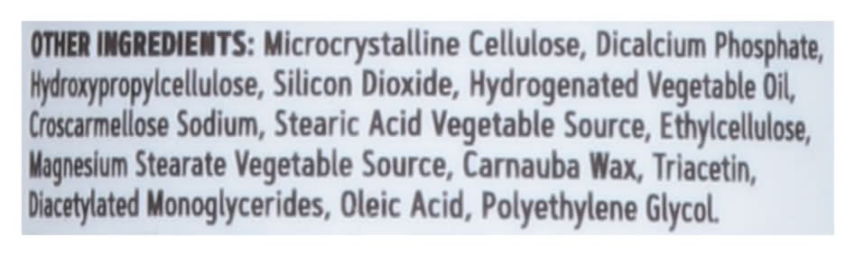 Ingredients: Other Ingredients: Microcrystalline Cellulose, Dicalcium Phosphate, Hydroxypropylcellulose, Silicon Dioxide, Hydrogenated Vegetable Oil, Croscarmellose Sodium, Stearic Acid Vegetable Source, Ethylcellulose, Magnesium Stearate Vegetable Source, Carnauba Wax, Triacetin, Diacetylated Monoglycerides, Oleic Acid, Polyethylene Glycol
