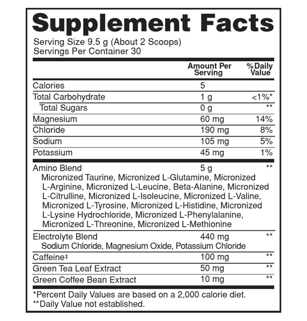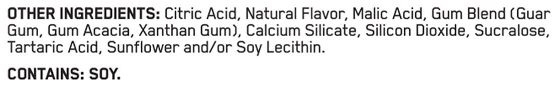 Ingredients: Amino Blend: Micronized Taurine, Micronized L-Glutamine, Micronized L-Arginine, Micronized L-Leucine, Beta-Alanine, Micronized L-Citrulline, Micronized L-Isoleucine, Micronized L-Valine, Micronized L-Tyrosine, Micronized L-Histidine, Micronized L-Lysine Hydrochloride, Micronized L-Phenylalanine, Micronized L-Threonine, Micronized L-Methionine. Electrolyte Blend: Sodium Chloride, Magnesium Oxide, Potassium Chloride. Other Ingredients: Citric Acid, Natural Flavor, Malic Acid, Gum Blend (Guar Gum, Gum Acacia, Xanthan Gum), Calcium Silicate, Silicon Dioxide, Sucralose, Tartaric Acid, Sunflower and/or Soy Lecithin Contains: Soybeans