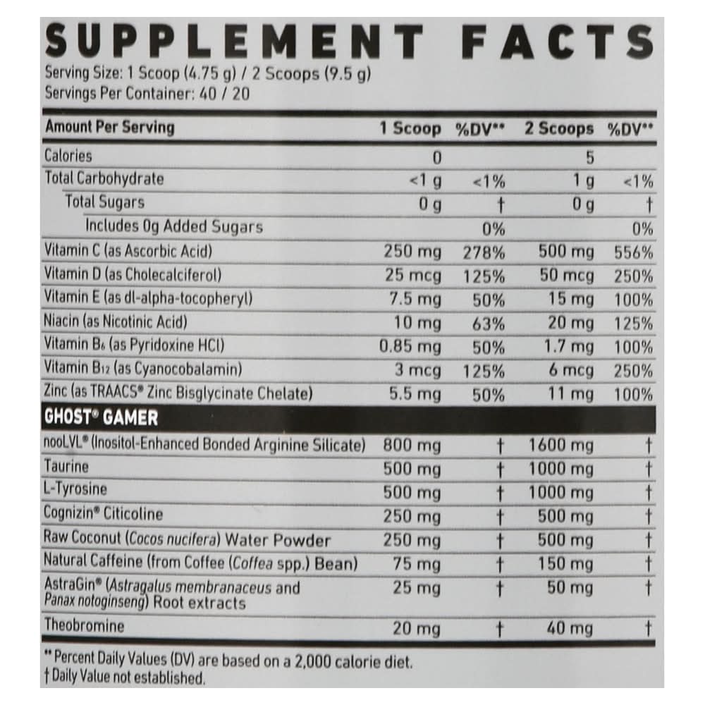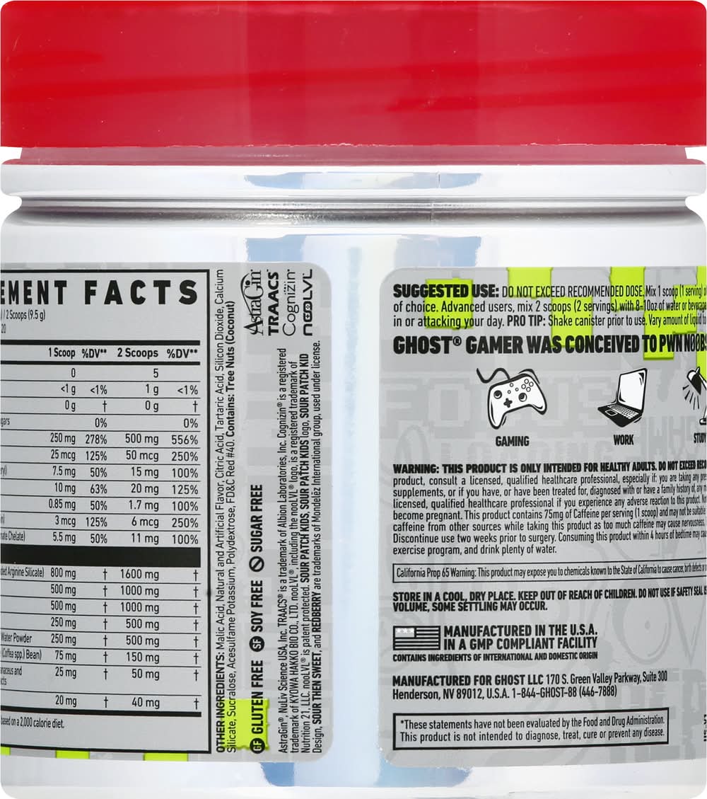 Directions for use: Suggested Use: Do not exceed recommended dose. Mix each scoop (1 serving) of Ghost Gamer with 4-6 oz of water or beverage of choice. Advanced users, mix 2 scoops (2 servings) with 8-10 oz of water or beverage of choice. Consume prior to dropping in, plugging in or attacking your day. Pro Tip: Shake canister prior to use. Vary amount of liquid to taste. - Directions: Suggested Use: Do not exceed recommended dose. Mix each scoop (1 serving) of Ghost Gamer with 4-6 oz of water or beverage of choice. Advanced users, mix 2 scoops (2 servings) with 8-10 oz of water or beverage of choice. Consume prior to dropping in, plugging in or attacking your day. Pro Tip: Shake canister prior to use. Vary amount of liquid to taste. Store in a cool, dry place. Storage recommendation: Store in a cool, dry place.