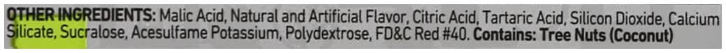 Ingredients: Malic Acid, Natural and Artificial Flavor, Citric Acid, Tartaric Acid, Silicon Dioxide, Calcium Silicate, Sucralose, Acesulfame Potassium, Polydextrose, FD&C Red 40 Contains: Tree Nuts