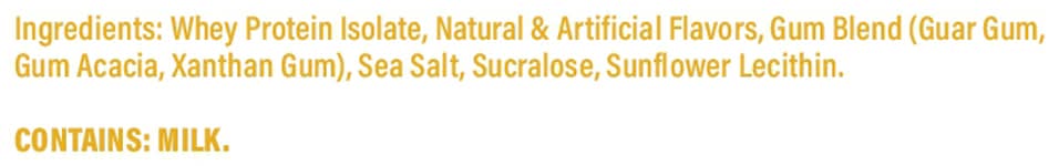 Ingredients: Whey Protein Isolate, Natural & Artificial Flavors, Gum Blend (Guar Gum, Gum Acacia, Xanthan Gum), Sea Salt, Sucralose, Sunflower Lecithin Contains: Milk, Milk, Soybeans, Eggs