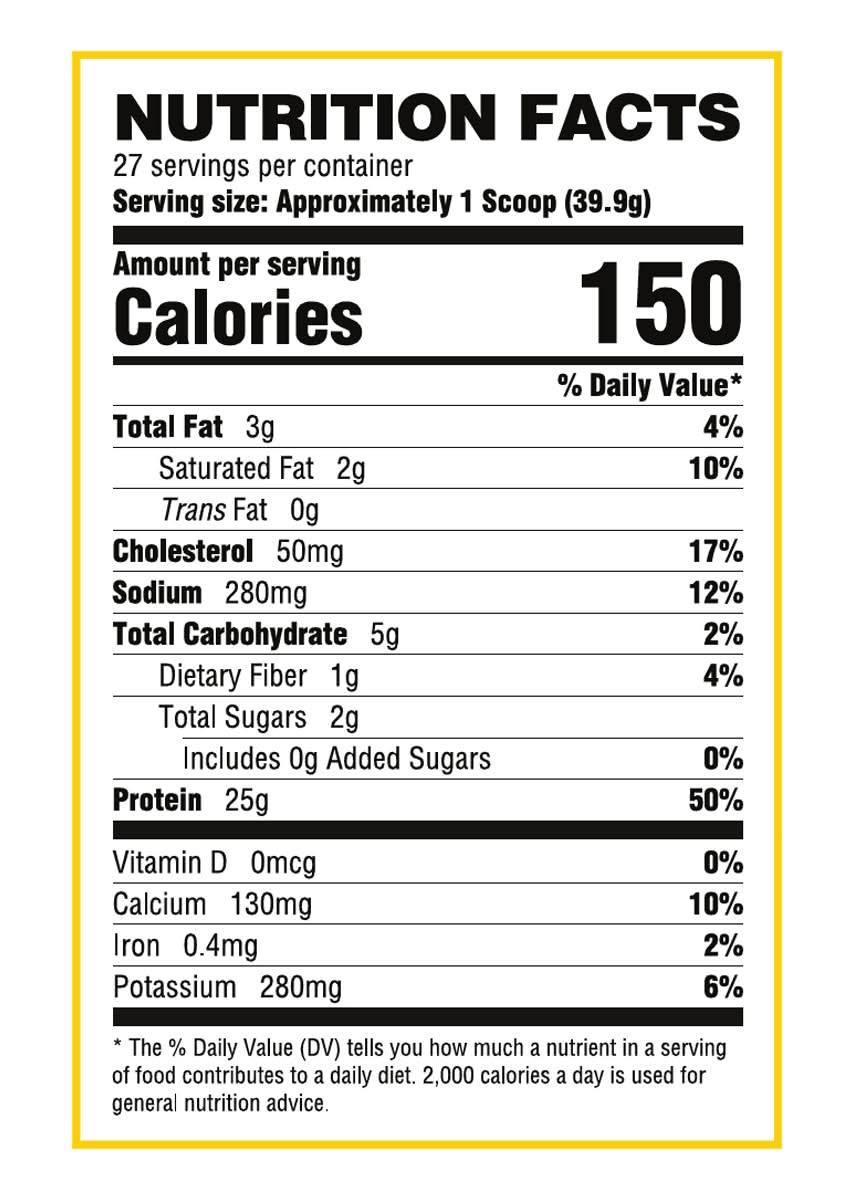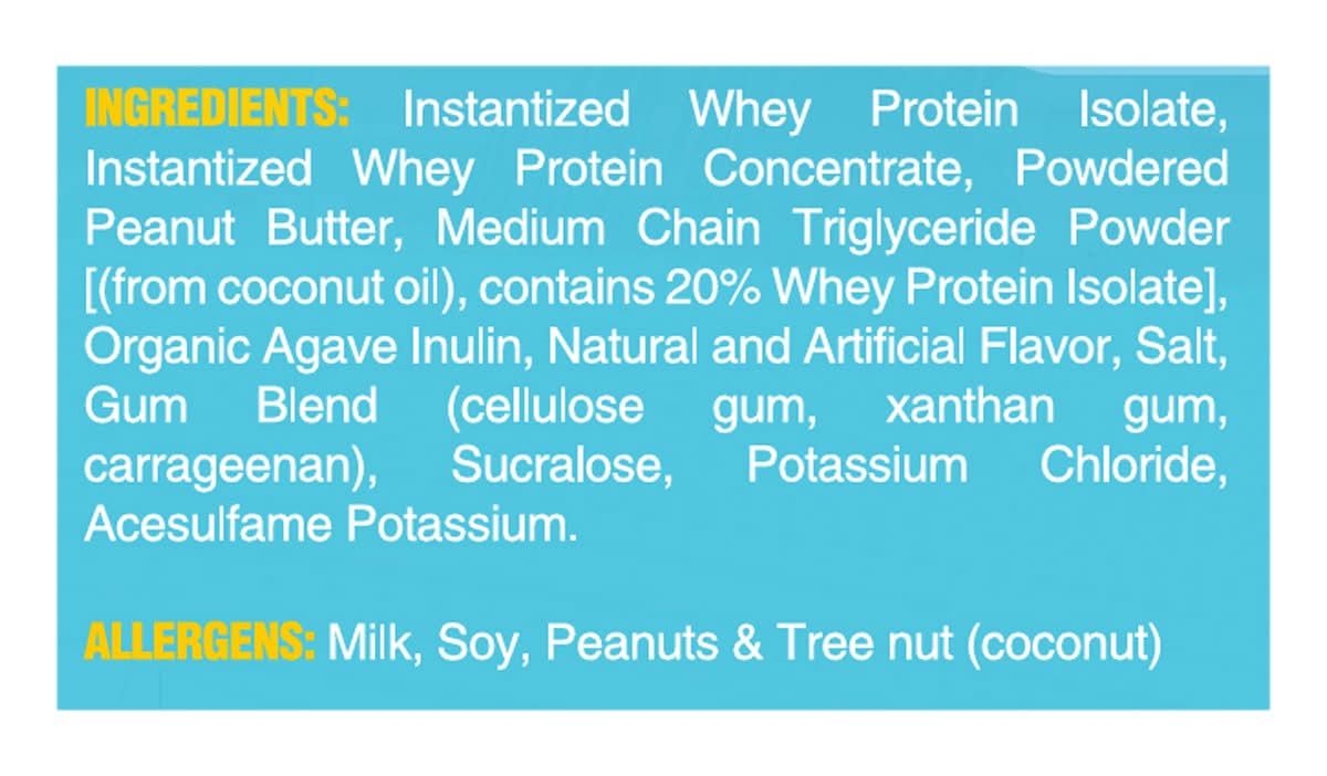 Ingredients: Instantized Whey Protein Isolate, Instantized Whey Protein Concentrate, Powdered Peanut Butter, Medium Chain Triglyceride Powder [(from Coconut Oil), Contains 20% Whey Isolate], Organic Agave Inulin, Natural and Artificial Flavor, Salt, Gum Blend (Cellulose Gum, Xanthan Gum, Carrageenan), Sucralose, Potassium Chloride, Acesulfame Potassium Contains: Milk, Soybeans, Peanuts, Tree Nuts, Coconuts