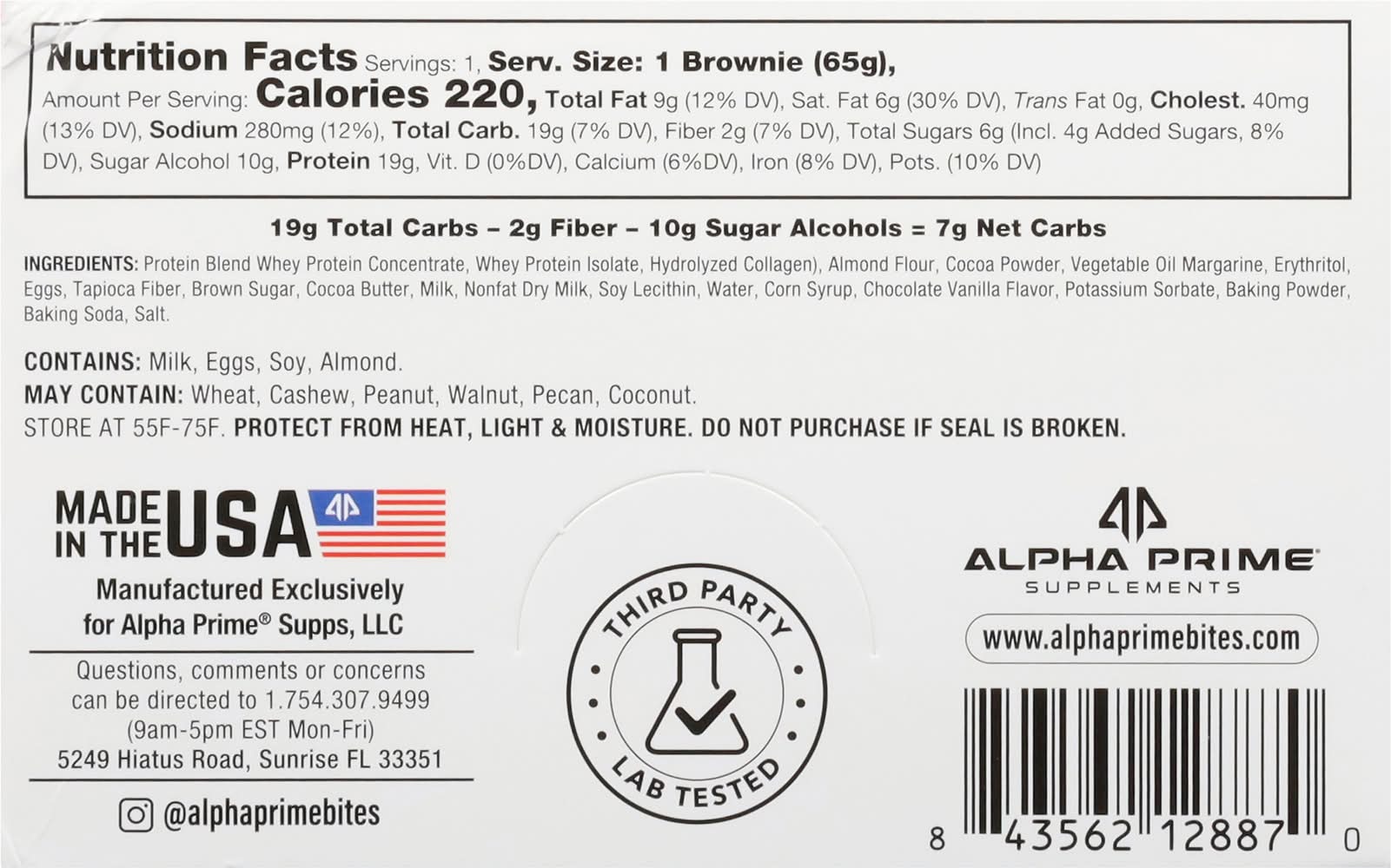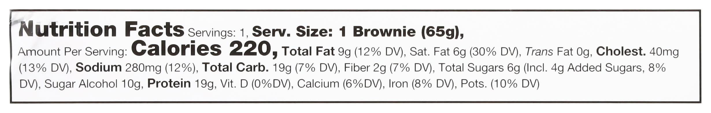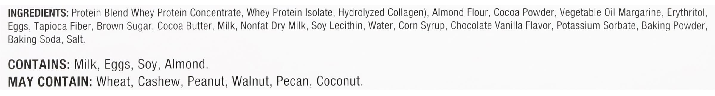 Ingredients: Protein Blend Whey Protein Concentrate, Whey Protein Isolate, Hydrolyzed Collagen, Almond Flour, Cocoa Powder, Vegetable Oil Margarine, Erythritol, Eggs, Tapioca Fiber, Brown Sugar, Cocoa Butter, Milk, Nonfat Dry Milk, Soy Lecithin, Water, Corn Syrup, Chocolate Vanilla Flavor, Potassium Sorbate, Baking Powder, Baking Soda, Salt Contains: Tree Nuts, Almonds, Milk, Soybeans, Corn, Eggs, Wheat, Tree Nuts, Cashews, Peanuts, Tree Nuts, Walnuts/Butternuts, Tree Nuts, Pecans, Tree Nuts, Coconuts
