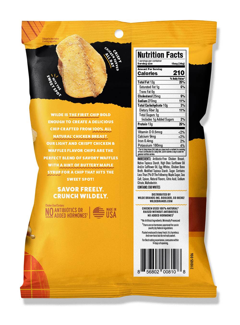 Wilde Protein Chips - Chicken and Waffles Crafted from real ingredients • Chicken breast • Egg Whites • Bone broth Chicken used 100% natural* raised without antibiotics no added hormones† *No artificial ingredients: minimally processed †There are no hormones approved for use in the production of poultry • Flavor: Chicken & waffles • Pack size: 8 • Size: 1