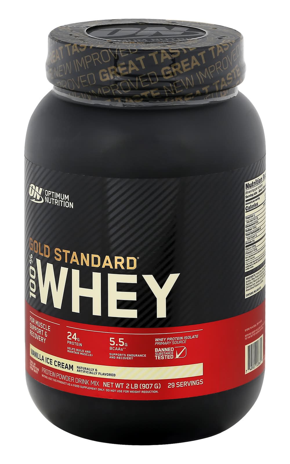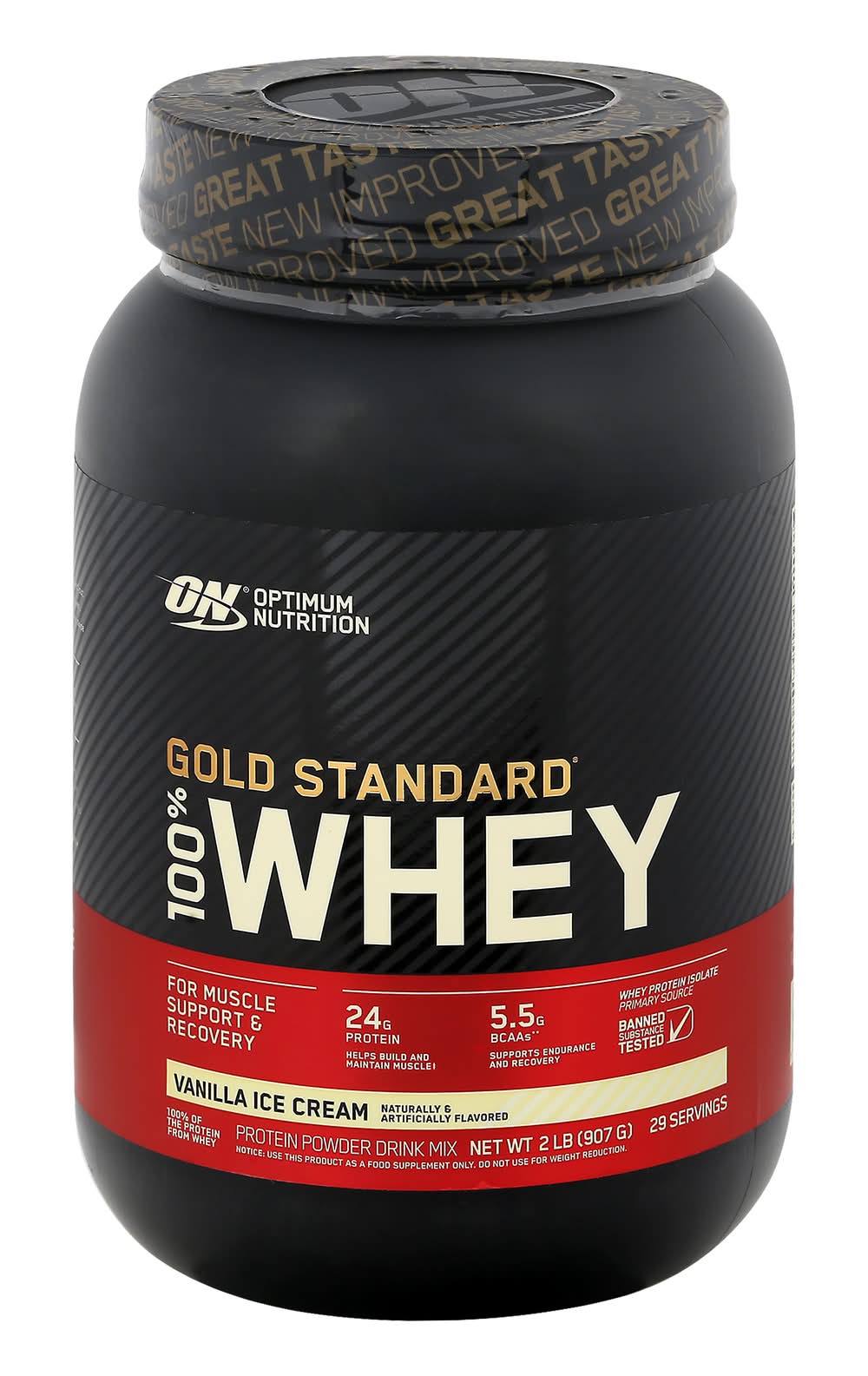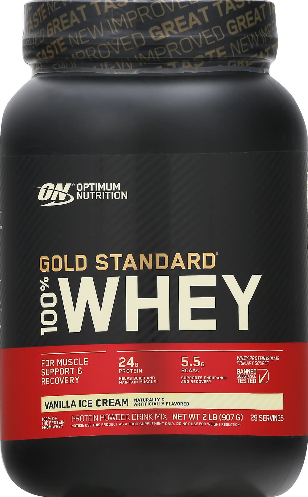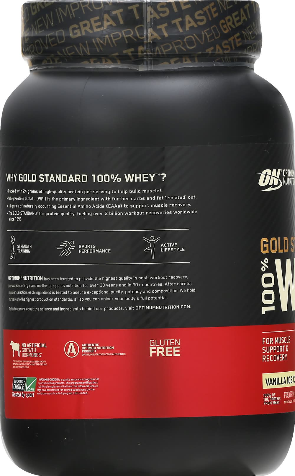 Protein powder drink mix. Naturally & artificially flavored. 24 g protein. 5.5 g BCAAs (Naturally occurring amino acids). Gluten free. 29 servings. For muscle support & recovery. Helps build and maintain muscle (When taken over time with regular resistance training). Supports endurance and recovery. Whey protein isolate primary source. Banned substance tested. 100% of the protein from whey. Gold Standard 100% Whey is designed for maximum mixability and superior drinkability. Contents sold by weight not volume. Some settling will occur. Why Gold Standard 100% Whey? Packed with 24 grams of high-quality protein per serving to help build muscle (When taken over time with regular resistance training). Whey Protein Isolate (WPI) is the primary ingredient with further carbs and fat 'isolated' out. 11 grams of naturally occuring Essential Amino Acids (EAAs) to support muscle recovery. The Gold Standard for protein quality, fueling over 2 billion workout recoveries worldwide since 1998. Strength training. Sports performance. Active lifestyle. Optimum Nutrition has been trusted to provide the highest quality in post-workout recovery, pre-workout energy, and on-the-go sports nutrition for over 30 years and in 90+ countries. After careful supplier selection, each ingredient is tested to assure exceptional purity, potency and composition. We hold ourselves the highest production standards, all so you can unlock your body's full potential. No artificial growth hormones (A significant difference has been shown between milk derived from rBST-treated and non-rBST treated cows). Serving scoop included, but may settle to the bottom during shipping. Informed-Choice - Trusted by sport. informed-choice.org. Informed-Choice is a quality assurance program for sports nutrition products. The program certifies that nutritional supplements that bear the Informed-Choice logo have been tested for banned substances by the world class sports anti-doping lab, LGC Limited. optimumnutrition.com. Check out optimumnutrition.com for recipes and training tips. Authentic Optimum Nutrition Product: optimumnutrition.com/authentic. Manufactured in the USA. This product contains ingredients of international and domestic origin. • Flavor: Vanilla ice cream • Size: 1 • Number of servings: 29 • Optimum Nutrition, Downers Grove, IL, 60515.