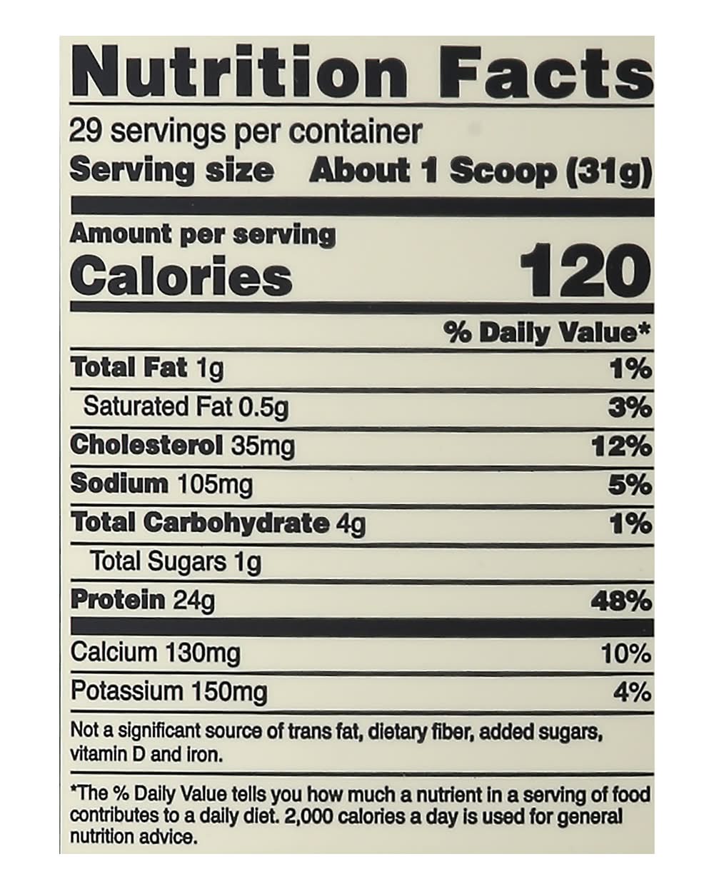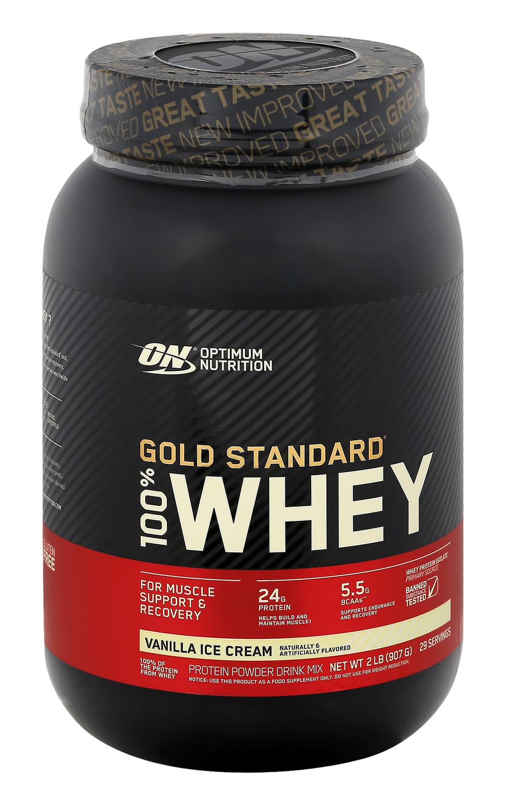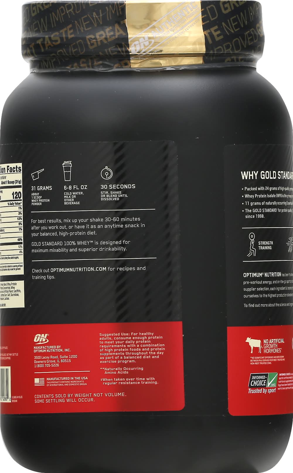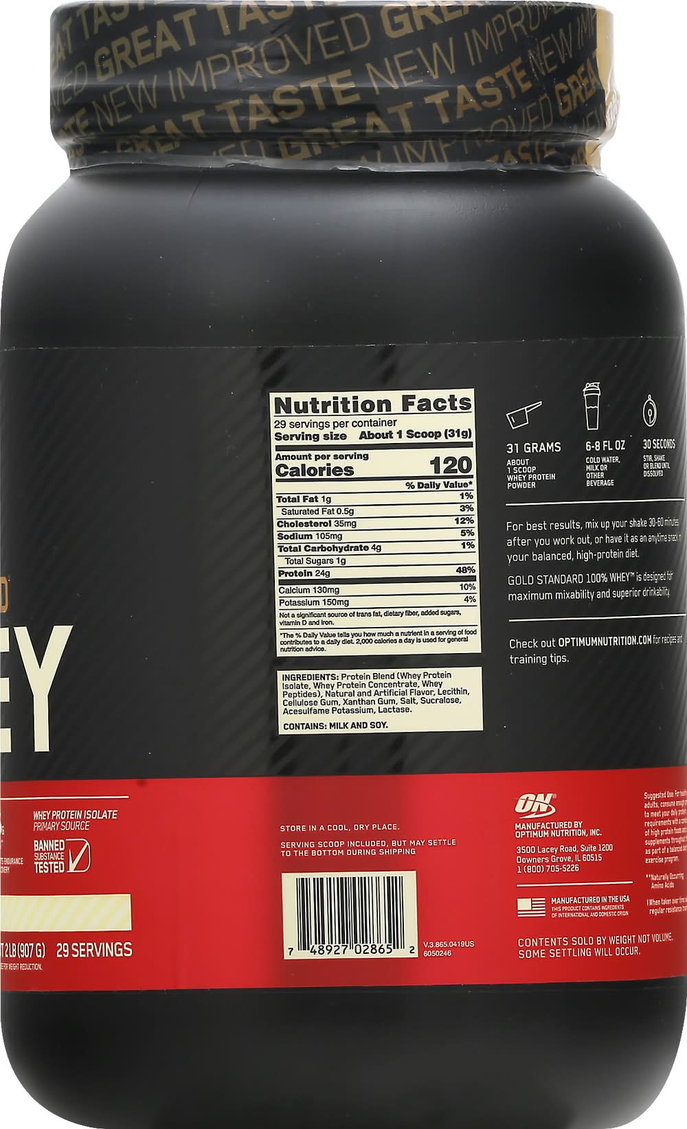 Protein powder drink mix. Naturally & artificially flavored. 24 g protein. 5.5 g BCAAs (Naturally occurring amino acids). Gluten free. 29 servings. For muscle support & recovery. Helps build and maintain muscle (When taken over time with regular resistance training). Supports endurance and recovery. Whey protein isolate primary source. Banned substance tested. 100% of the protein from whey. Gold Standard 100% Whey is designed for maximum mixability and superior drinkability. Contents sold by weight not volume. Some settling will occur. Why Gold Standard 100% Whey? Packed with 24 grams of high-quality protein per serving to help build muscle (When taken over time with regular resistance training). Whey Protein Isolate (WPI) is the primary ingredient with further carbs and fat 'isolated' out. 11 grams of naturally occuring Essential Amino Acids (EAAs) to support muscle recovery. The Gold Standard for protein quality, fueling over 2 billion workout recoveries worldwide since 1998. Strength training. Sports performance. Active lifestyle. Optimum Nutrition has been trusted to provide the highest quality in post-workout recovery, pre-workout energy, and on-the-go sports nutrition for over 30 years and in 90+ countries. After careful supplier selection, each ingredient is tested to assure exceptional purity, potency and composition. We hold ourselves the highest production standards, all so you can unlock your body's full potential. No artificial growth hormones (A significant difference has been shown between milk derived from rBST-treated and non-rBST treated cows). Serving scoop included, but may settle to the bottom during shipping. Informed-Choice - Trusted by sport. informed-choice.org. Informed-Choice is a quality assurance program for sports nutrition products. The program certifies that nutritional supplements that bear the Informed-Choice logo have been tested for banned substances by the world class sports anti-doping lab, LGC Limited. optimumnutrition.com. Check out optimumnutrition.com for recipes and training tips. Authentic Optimum Nutrition Product: optimumnutrition.com/authentic. Manufactured in the USA. This product contains ingredients of international and domestic origin. • Flavor: Vanilla ice cream • Size: 1 • Number of servings: 29 • Optimum Nutrition, Downers Grove, IL, 60515.