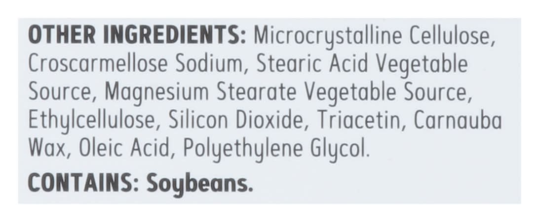Ingredients: Other Ingredients: Microcrystalline Cellulose, Croscarmellose Sodium, Stearic Acid Vegetable Source, Magnesium Stearate Vegetable Source, Ethylcellulose, Silicon Dioxide, Triacetin, Carnauba Wax, Oleic Acid, Polyethylene Glycol Contains: Soybeans