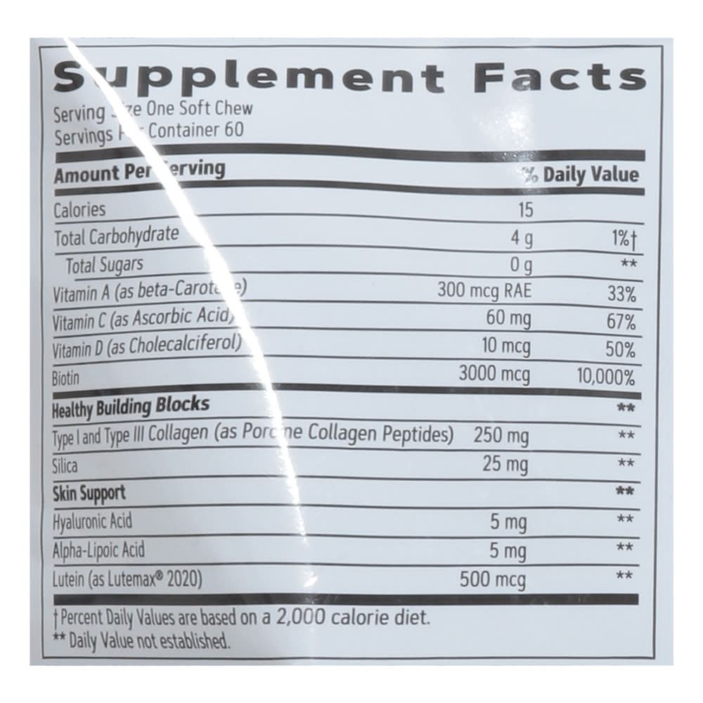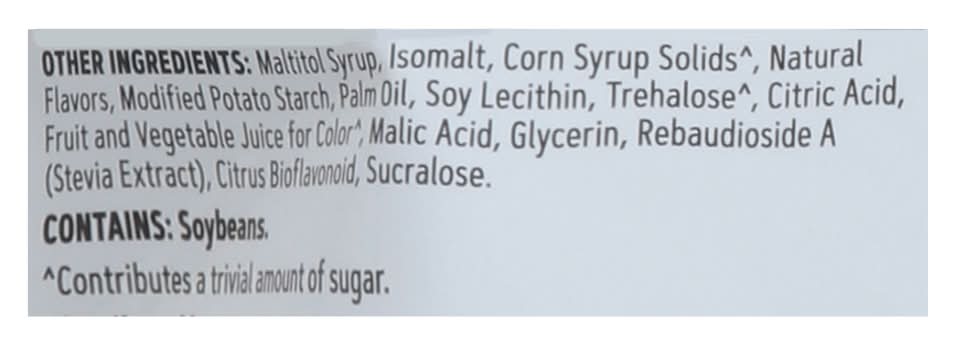 Ingredients: Healthy Building Blocks: Type I and Type Ii Collagen (as Porcine Collagen Peptides). Silica, Skin Support: Hyaluronic Acid, Alpha-Lipoic Acid, Lutein (as Lutemax 2020). Other Ingredients: Maltitol Syrup, Isomalt, Corn Syrup Solids (Contributes a Trivial Amount of Sugar), Natural Flavors, Modified Potato Starch, Palm Oil, Soy Lecithin, Trehalose (Contributes a Trivial Amount of Sugar), Citric Acid, Fruit and Vegetable Juice for Color (Contributes a Trivial Amount of Sugar), Malic Acid, Glycerin, Rebaudioside a (Stevia Extract), Citrus Bioflavonoid, Sucralose Contains: Soybeans