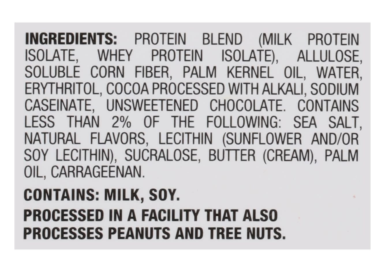 Ingredients: Protein Blend (Milk Protein Isolate, Whey Protein Isolate), Allulose, Soluble Corn Fiber, Palm Kernel Oil, Water, Erythritol, Cocoa Processed with Alkali, Sodium Caseinate, Unsweetened Chocolate. Contains Less than 2% of the Following: Sea Salt, Natural Flavors, Lecithin (Sunflower and/or Soy Lecithin), Sucralose, Butter (Cream), Palm Oil, Carrageenan Contains: Milk, Soybeans, Peanuts, Tree Nuts