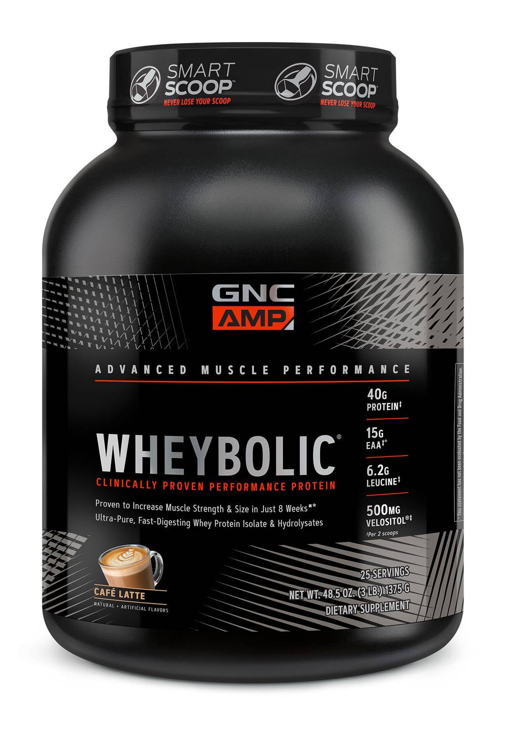 GNC AMP WHEYBOLIC: AMERICA'S #1 PROTEIN POWDER BRAND FOR BUILDING STRENGTH†*^▪ • PROVEN TO INCREASE MUSCLE STRENGTH IN JUST 8 WEEKS: GNC AMP Wheybolic® protein powder is clinically proven to increase muscle strength by 30% after only 8 weeks of resistance training▪*. • FAST-DIGESTING PROTEIN POWDER WITH VELOSITOL: Wheybolic features a blend of ultra-pure and fast-digesting whey protein with added leucine and Velositol to accelerate muscle protein synthesis^*. • SUPPORT PERFORMANCE AND STAMINA: Wheybolic is clinically proven to support strength, performance, and stamina▪•*. It’s also great for non-training days as it provides critical amino acids to fuel muscles.* • SUPPLY A STEADY STREAM OF AMINOS: Wheybolic’s specialized blend of whey protein isolates and hydrolysates also makes a great addition between meals to supply critical EAA to fuel muscles recovering from intense training^*. • CHOOSE BANNED SUBSTANCE-TESTED PROTEIN: Unlike too-good-to-be-true protein supplements with proprietary blends, Wheybolic is certified Banned Substance Tested and designed to help build strength and size^*⬩. ^When used in conjunction with an exercise program *These statements have not been evaluated by the Food and Drug Administration. This product is not intended to diagnose, treat, cure, or prevent any disease. ▪An 8-week, randomized, double-blind, placebo-controlled study of 33 healthy men compared the effectiveness of this proprietary module of whey protein and leucine vs. an isocaloric carbohydrate placebo consumed before and after resistance training. Subjects consuming the leucine-whey protein supplement experienced greater increases in muscle strength than those on the placebo. Leucine-whey protein supplementation also increased muscle cross-sectional area from baseline. •In an 8-week randomized double-blind placebo controlled study of 30 healthy male volunteers comparing 1 set resistance training (RT) + active or carbohydrate placebo to 2 sets RT alone with no supplement, the active group showed equal gains in maximal muscle strength and muscle endurance compared to the control group. †Based on mass market (excluding Amazon) Nielsen data 4/3/2022–7/2/2022. • Flavor: Cafe latte • Size: 1