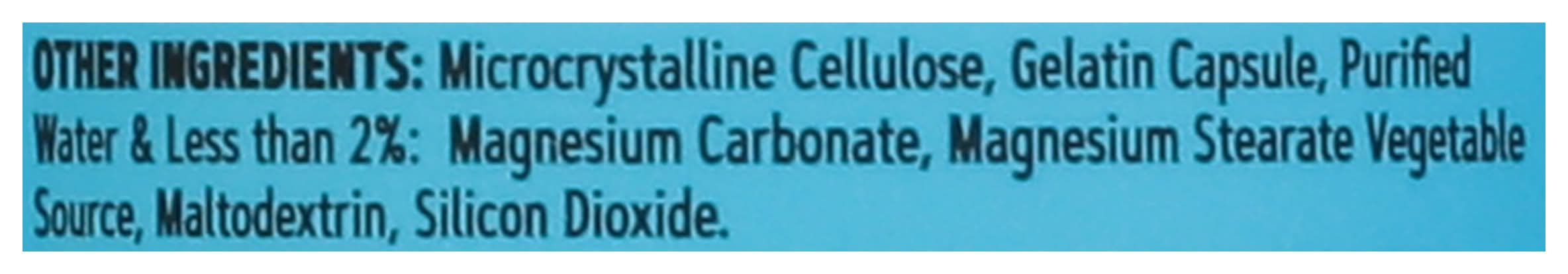 Ingredients: Other Ingredients: Microcrystalline Cellulose, Gelatin Capsule, Purified Water & Less than 2%: Magnesium Carbonate, Magnesium Stearate Vegetable Source, Maltodextrin, Silicon Dioxide