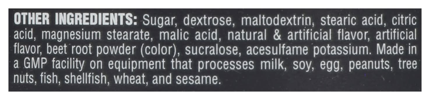 Ingredients: Other Ingredients: Sugar, Dextrose, Maltodextrin, Stearic Acid, Citric Acid, Magnesium Stearate, Malic Acid, Natural & Artificial Flavor, Artificial Flavor, Beet Root Powder (Color), Sucralose, Acesulfame Potassium Contains: Milk, Soybeans, Eggs, Peanuts, Tree Nuts, Fish, Crustacean Shellfish, Wheat, Sesame