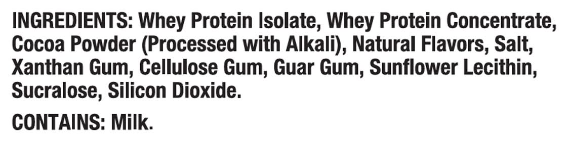 Ingredients: Whey Protein Isolate, Whey Protein Concentrate, Cocoa Powder (Processed with Alkali), Natural Flavors, Salt, Xanthan Gum, Cellulose Gum, Guar Gum, Sunflower Lecithin, Sucralose, Silicon Dioxide Contains: Milk