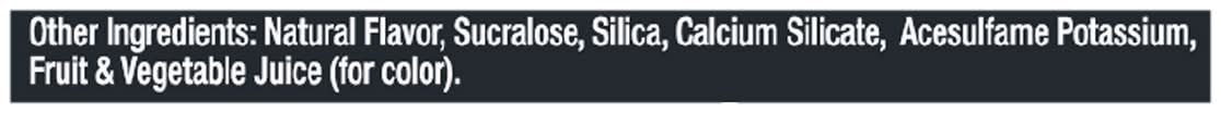 Ingredients: Other Ingredients: Natural Flavor, Sucralose, Silica, Calcium Silicate, Acesulfame Potassium, Fruit & Vegetable Juice (for Color)