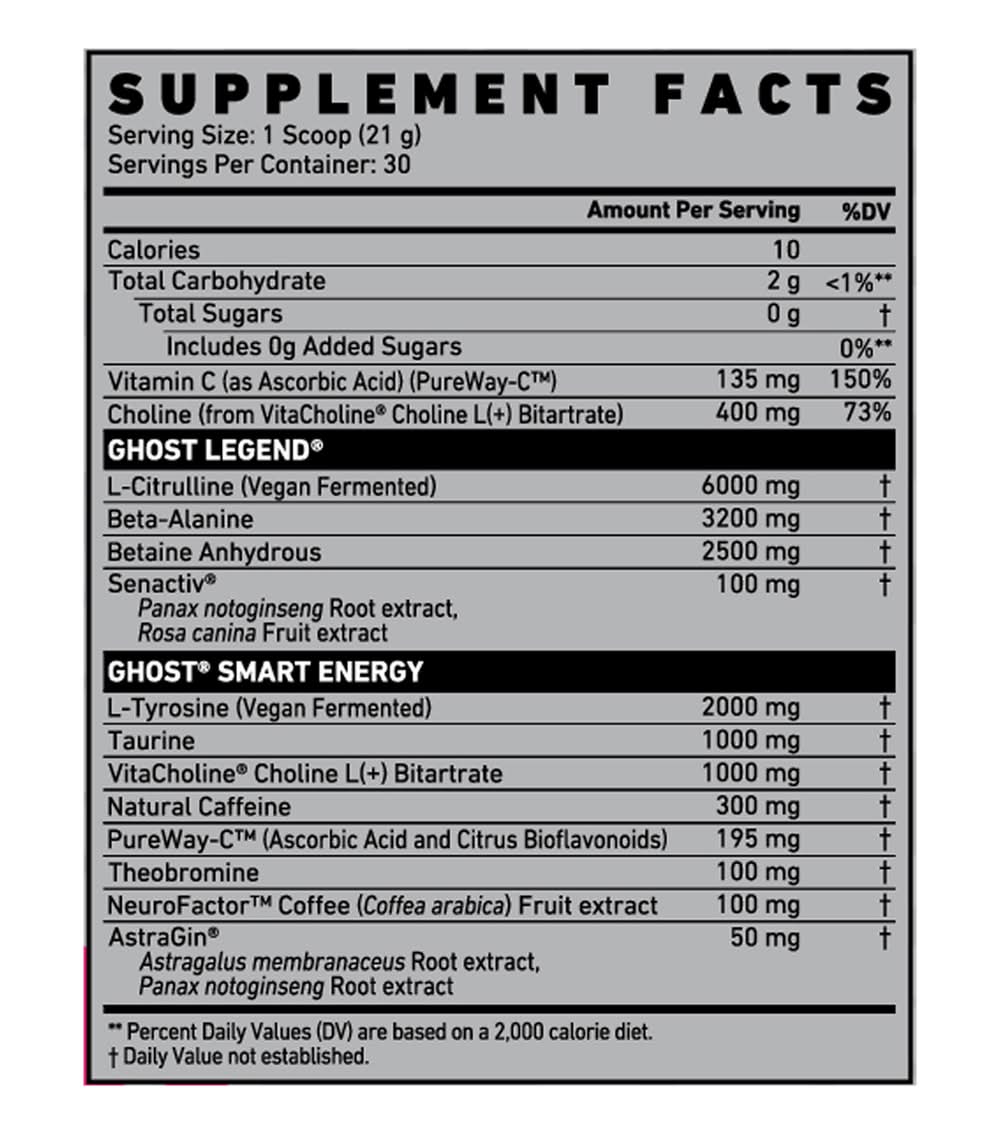 Directions for use: Suggested Use: Do not exceed 1 serving per day. Mix 1 scoop (1 serving) of Ghost Legend with 8-10 oz of water or beverage of choice. New users, and those sensitive to stimulants, should start with 1/2 serving (1/2 scoop) to assess their personal tolerance. Consume prior to exercise on training days. Storage recommendation: Store in a cool, dry place.