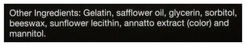 Ingredients: Other Ingredients: Gelatin, Safflower Oil, Glycerin, Sorbitol, Beeswax, Sunflower Lecithin, Annatto Extract (Color) and Mannitol