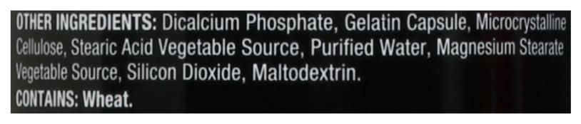 Ingredients: Other Ingredients: Dicalcium Phosphate, Gelatin Capsule, Microcrystalline Cellulose, Stearic Acid Vegetable Source, Purified Water, Magnesium Stearate Vegetable Source, Silicon Dioxide, Maltodextrin Contains: Wheat