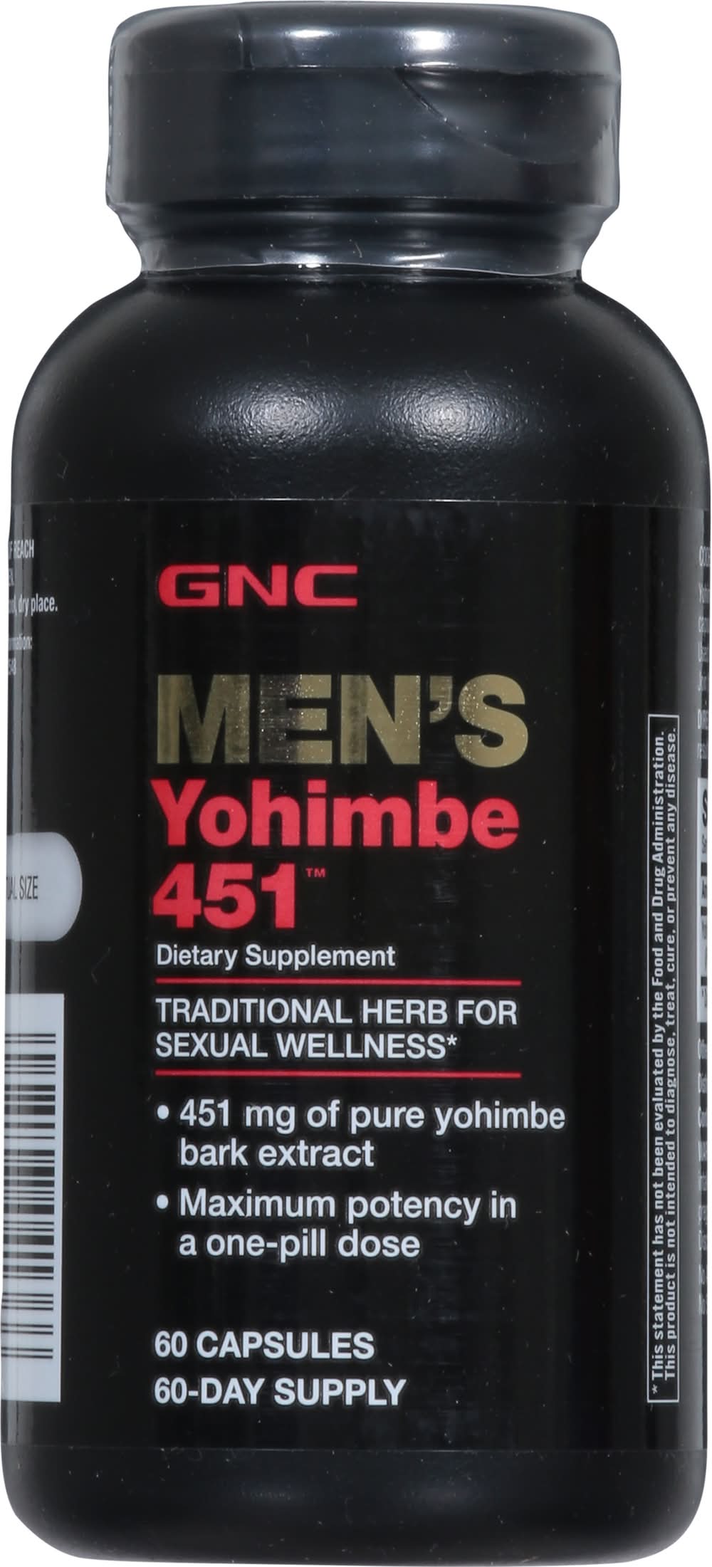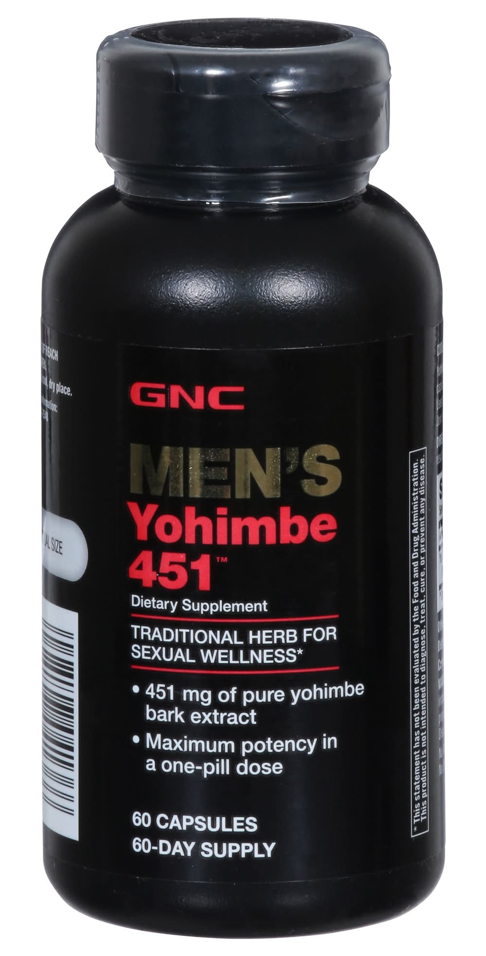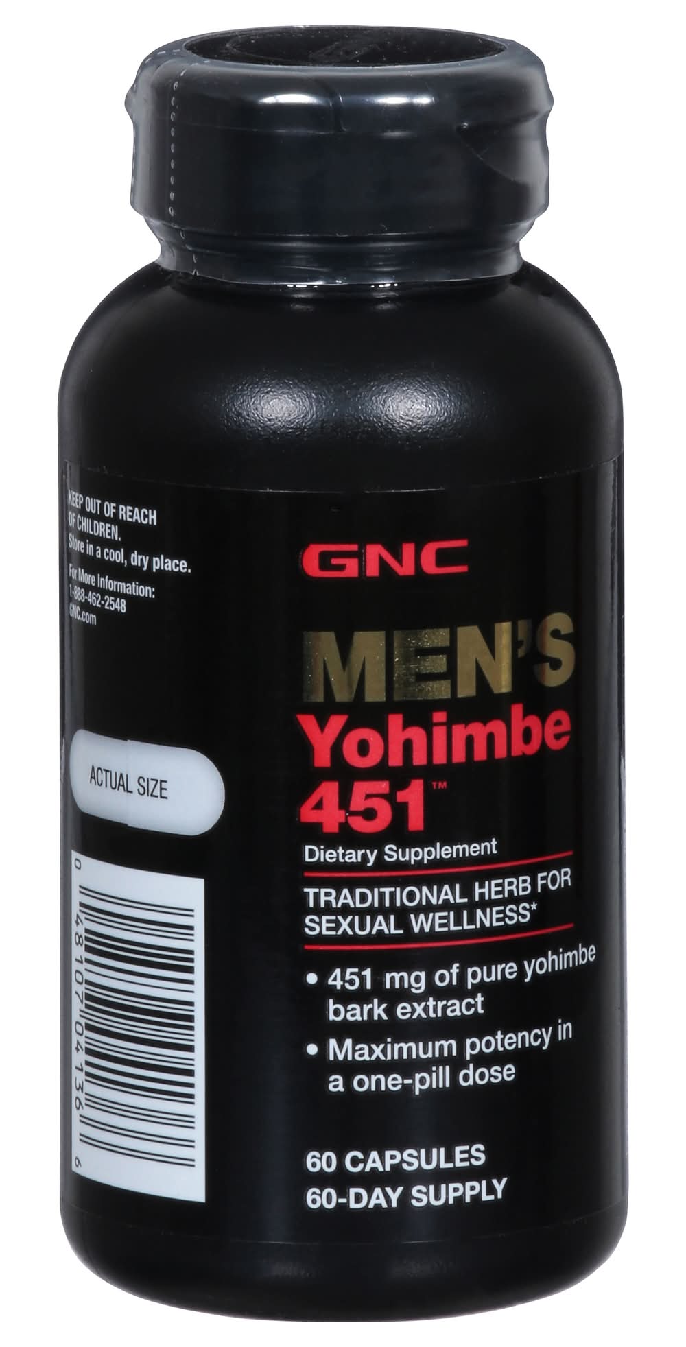 GNC Men's Yohimbe 451, 60 Capsules, Supports Sexual Health  • YOHIMBE 451 FOR SEXUAL HEALTH – A favorite among mature men, Yohimbe is a traditional herb used for sexual wellness.*  • HERBAL ALKALOID: Each capsule packs 451mg of pure standardized Yohimbe Bark extract (2% yohimbe alkaloid = 9mg) for maximum potency.  • FREE FROM WHAT YOU DON’T WANT: No Sugar, No Artificial Colors, No Artificial Flavors, Sodium Free, No Wheat, Gluten Free, No Soy, Yeast Free.  • BACKED BY SCIENCE: Since 1935, GNC has been committed to meeting the highest standards of quality, safety, and efficacy while applying the most up-to-date advances in nutritional science so you can live well.  *These statements have not been evaluated by the Food and Drug Administration. This product is not intended to diagnose, treat, cure, or prevent any disease.