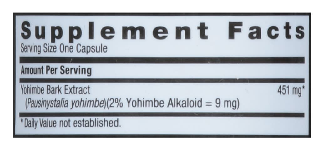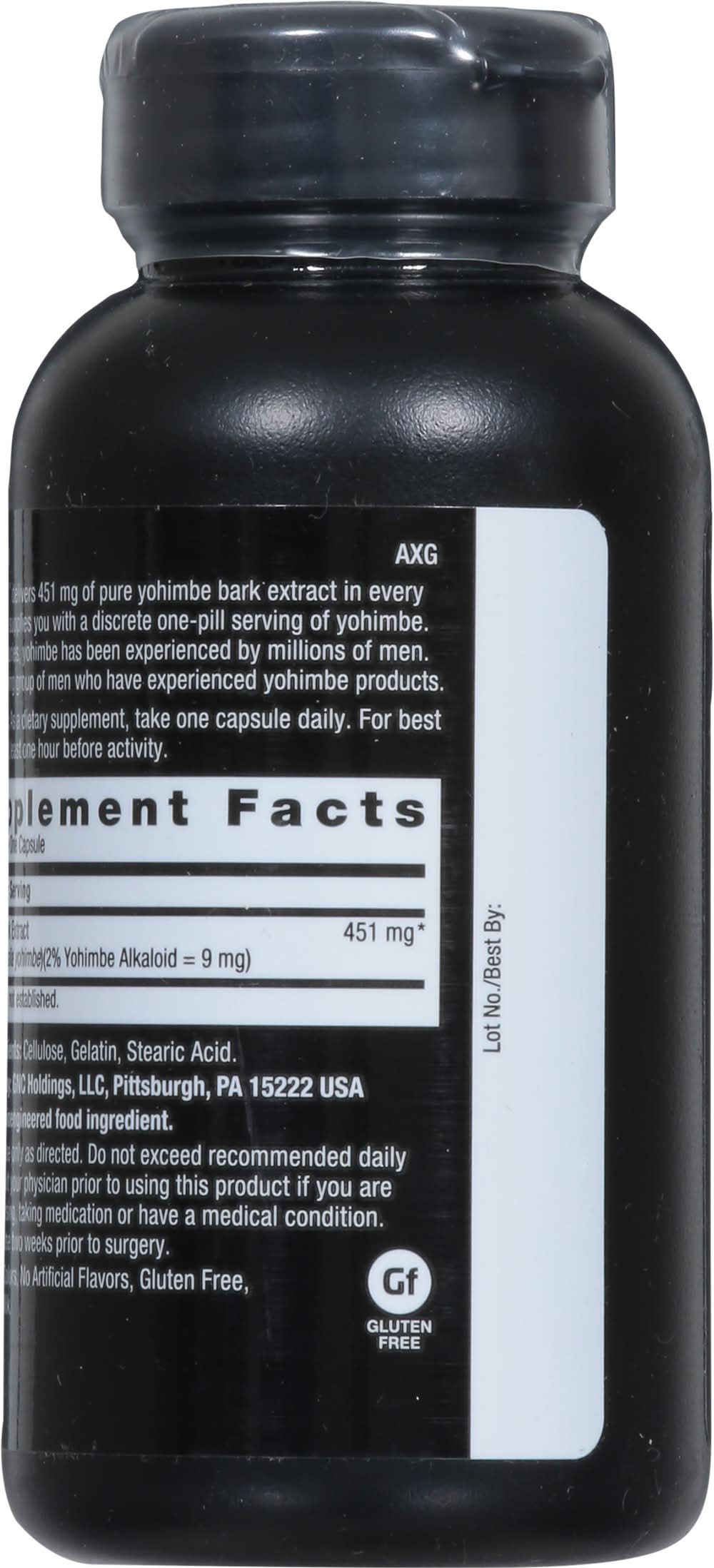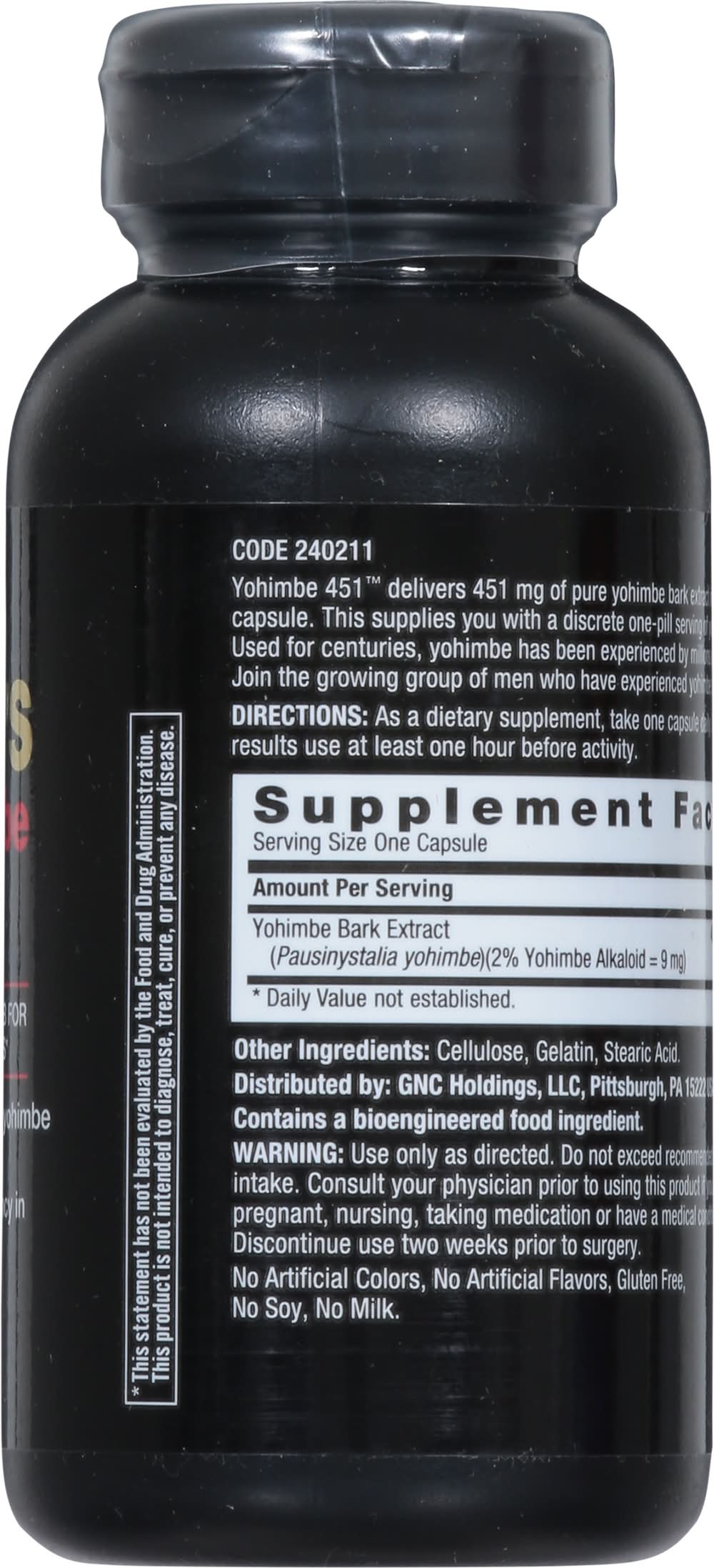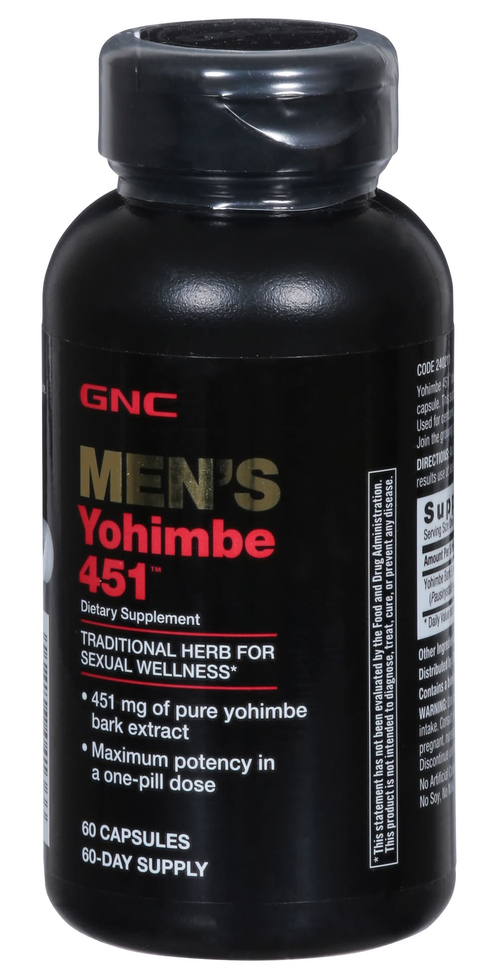 GNC Men's Yohimbe 451, 60 Capsules, Supports Sexual Health  • YOHIMBE 451 FOR SEXUAL HEALTH – A favorite among mature men, Yohimbe is a traditional herb used for sexual wellness.*  • HERBAL ALKALOID: Each capsule packs 451mg of pure standardized Yohimbe Bark extract (2% yohimbe alkaloid = 9mg) for maximum potency.  • FREE FROM WHAT YOU DON’T WANT: No Sugar, No Artificial Colors, No Artificial Flavors, Sodium Free, No Wheat, Gluten Free, No Soy, Yeast Free.  • BACKED BY SCIENCE: Since 1935, GNC has been committed to meeting the highest standards of quality, safety, and efficacy while applying the most up-to-date advances in nutritional science so you can live well.  *These statements have not been evaluated by the Food and Drug Administration. This product is not intended to diagnose, treat, cure, or prevent any disease.