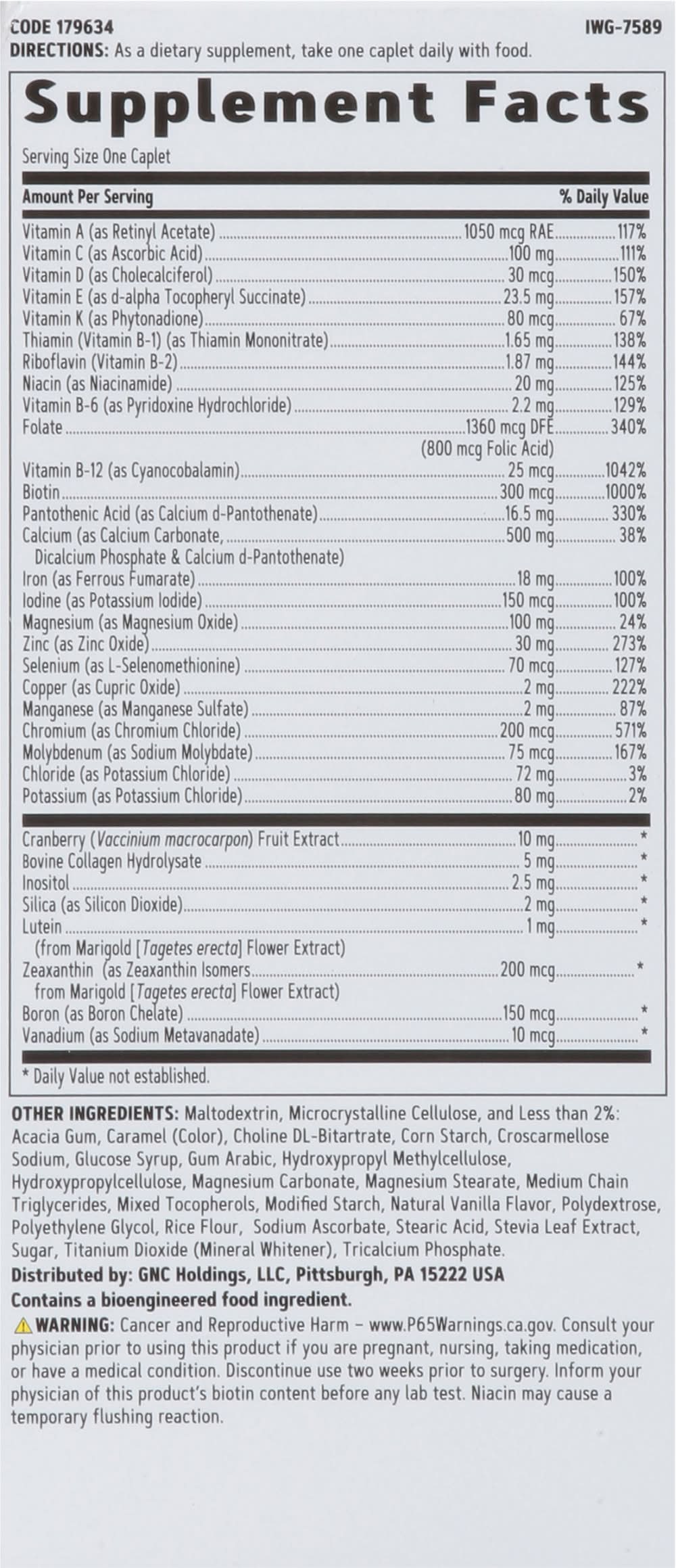 Multivitamin, One Daily, Essentials, Caplets GNC Holdings, LLC, Pittsburgh, PA, 15222, Ph: 888-462-2548