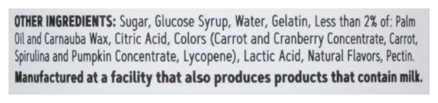 Ingredients: Other Ingredients: Sugar, Glucose Syrup, Water, Gelatin, Less than 2% of: Palm Oil and Carnauba Wax, Citric Acid, Colors (Carrot and Cranberry Concentrate, Carrot, Spirulina and Pumpkin Concentrate, Lycopene), Lactic Acid, Natural Flavors, Pectin Contains: Milk