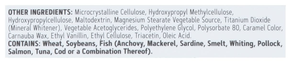 Ingredients: Other Ingredients: Microcrystalline Cellulose, Hydroxypropyl Methylcellulose, Hydroxypropylcellulose, Maltodextrin, Magnesium Stearate Vegetable Source, Titanium Dioxide (Mineral Whitener), Vegetable Acetoglycerides, Polyethylene Glycol, Polysorbate 80, Caramel Color, Carnauba Wax, Ethyl Vanillin, Ethyl Cellulose, Triacetin, Oleic Acid Contains: Wheat, Soybeans