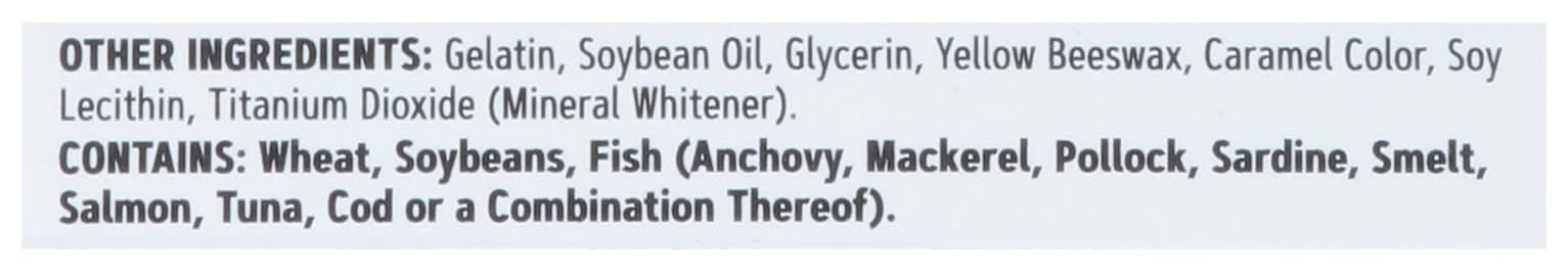 Ingredients: Other Ingredients: Gelatin, Soybean Oil, Glycerin, Yellow Beeswax, Caramel Color, Soy Lecithin, Titanium Dioxide (Mineral Whitener). 286721 Contains: Wheat, Soybeans, Fish, Anchovy, Fish, Mackerel, Fish, Pollock, Fish, Sardines, Fish, Salmon, Fish, Tuna, Fish, Cod, Fish