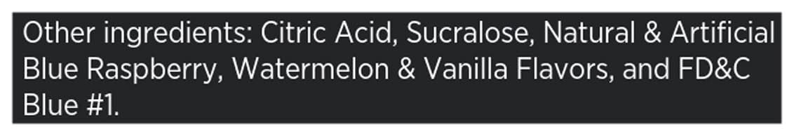 Ingredients: Karbolyn (Homopolysaccharide Derived from Potato, Rice and Corn). Other Ingredients: Citric Acid, Sucralose, Natural & Artificial Blue Raspberry, Watermelon & Vanilla Flavors, and FD&C Blue 1 Contains: Corn