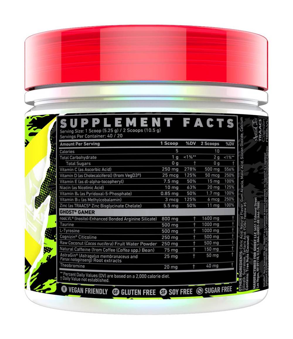 GHOST - GAMER: FOCUS x ENERGY* - FAZE UP - 40 Servings GHOST GAMER was conceived to pwn noobs in and out of the game*. It is the perfect combo of nootropics and energy from Natural Caffeine* delivered in true GHOST form with a sick design, epic flavors like FAZE UP, in a stacked, vegan friendly formula. Regardless of if you’re dropping in for a round of BR, driving the lane in 2k or squaring up a PK in FIFA, GHOST GAMER delivers. • Features nooLVL, a patented ingredient, found exclusively in GHOST GAMER • Provides 150 mg of Natural Caffeine (per two scoops) to help support improved physical endurance activity & performance.* • Supplies L-Tyrosine, a free-form amino acid which provides dietary support for normal, healthy nervous system activity.* • Includes Cognizin a patented brain health ingredient. Each single-scoop serving provides 250 mg. • Contains AstraGin, a patented compound made up of astragalus and ginseng root. • Provides a Non-GMO, vegan friendly vitamin D sourced from the patented VegaD3. For persons with low sun exposure, vitamin D intake from supplements, fortified foods and oily fish are important in maintaining optimal vitamin D status.* • All GHOST products feature a label that fully discloses the dose of each active ingredient. Zero proprietary blends means you know what you’re getting in each and every scoop. • Flavor: Faze up • Size: 1